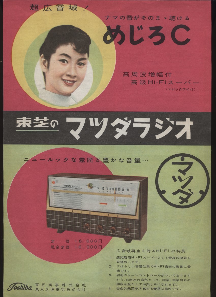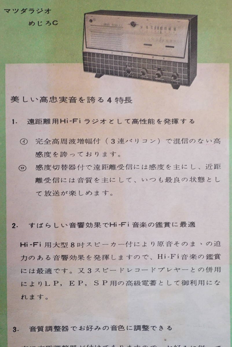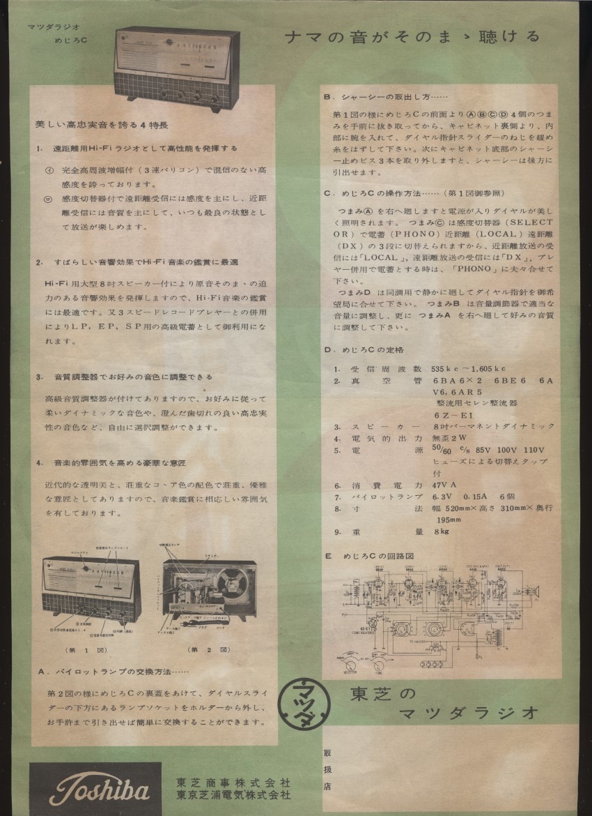 東芝のマツダラジオ めじろC チラシ1枚 ハイファイラジオ マジックアイ付 検:昭和レトロラジオ 中大型ラジオ 東芝ラジオ 回路図 操作方法
