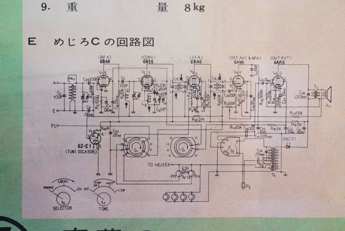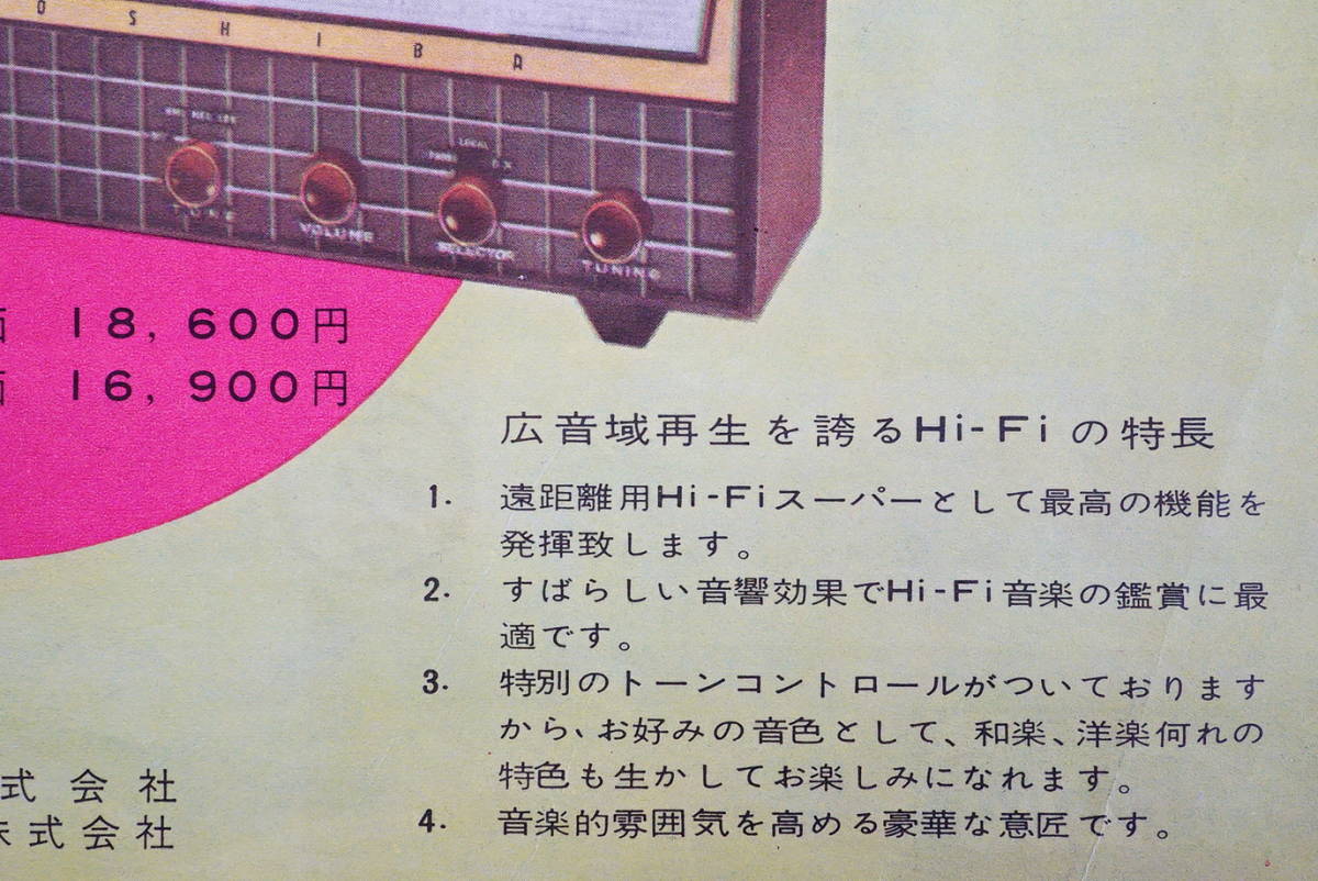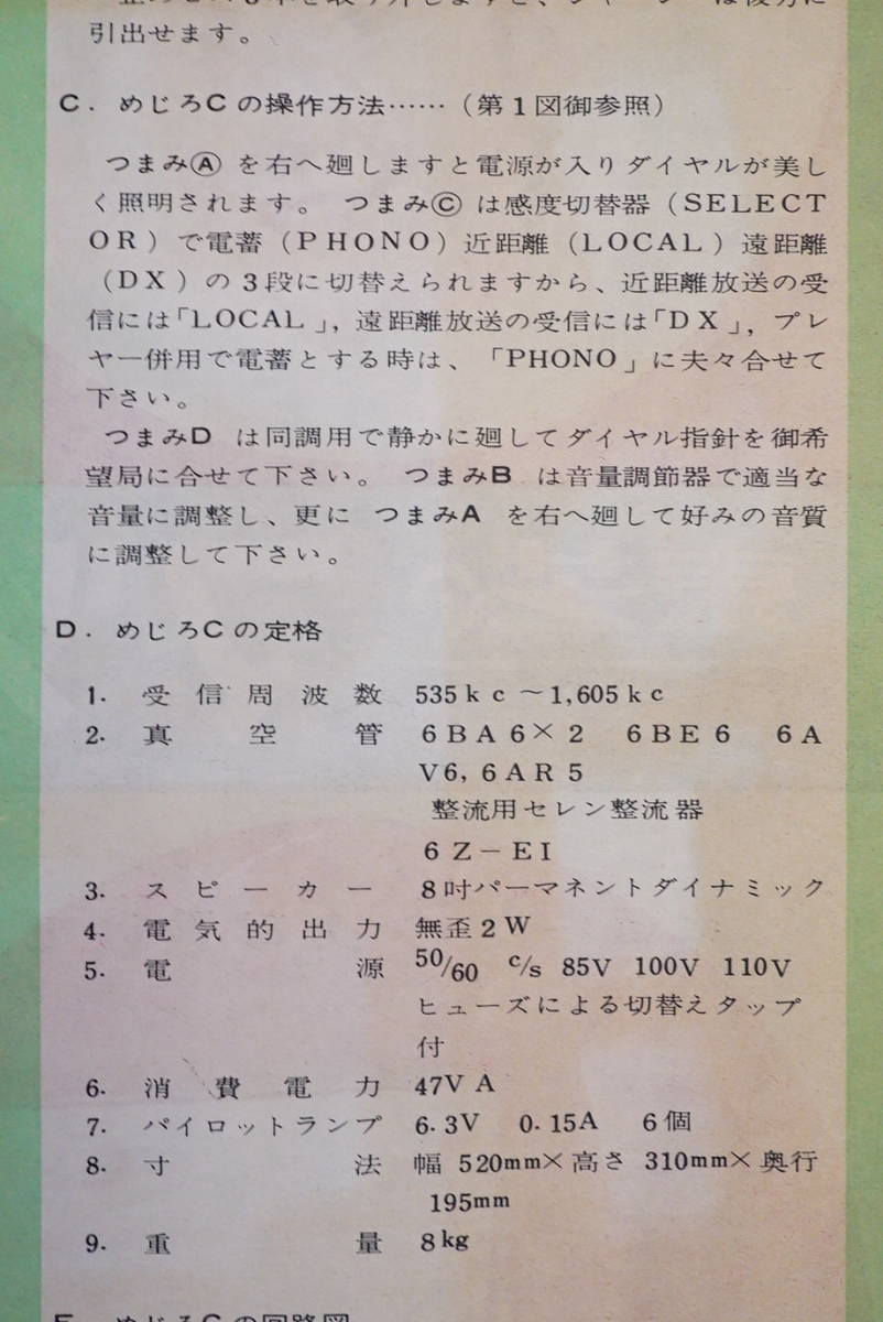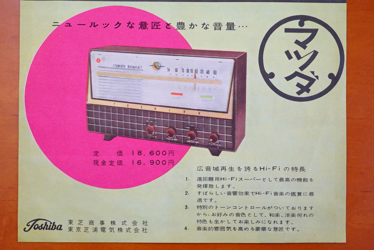 東芝のマツダラジオ めじろC チラシ1枚 ハイファイラジオ マジックアイ付 検:昭和レトロラジオ 中大型ラジオ 東芝ラジオ 回路図 操作方法