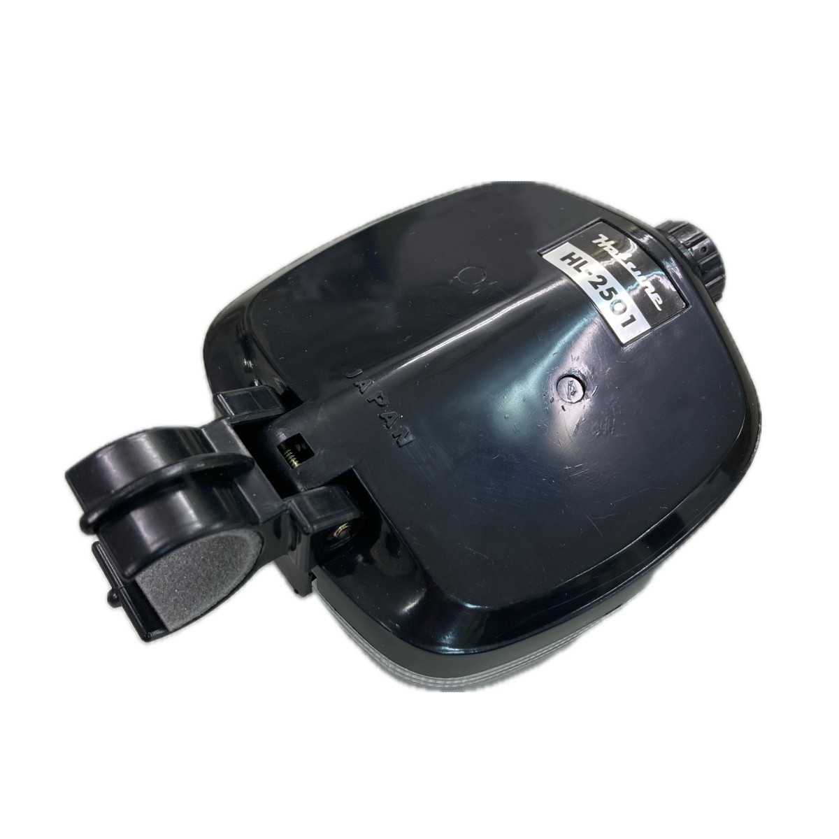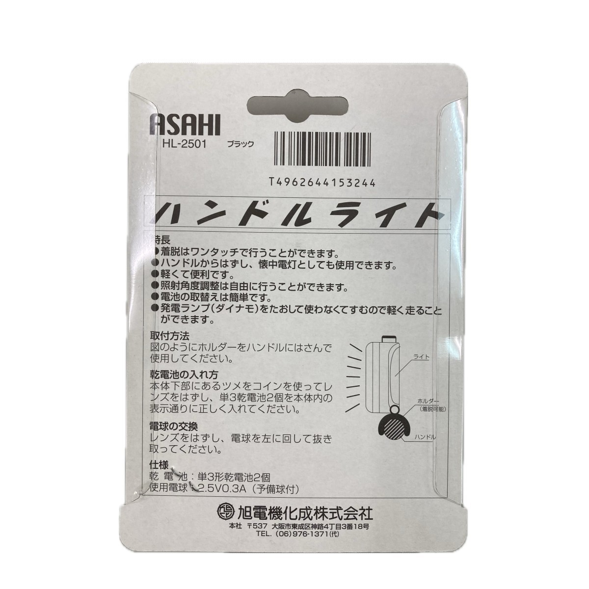着脱ワンタッチ、ハンドルにはめるだけ。取り外して懐中電灯として使えます。電池の取り替えカンタン。乾電池:単3形乾電池2個(別売)使用電球:2.5V0.3A(予備電球付)