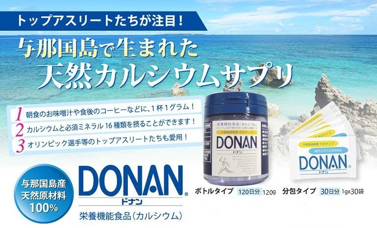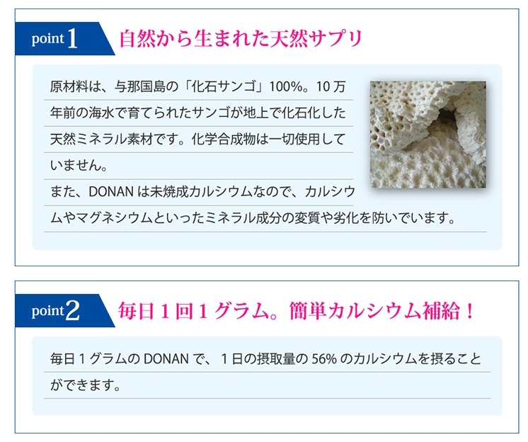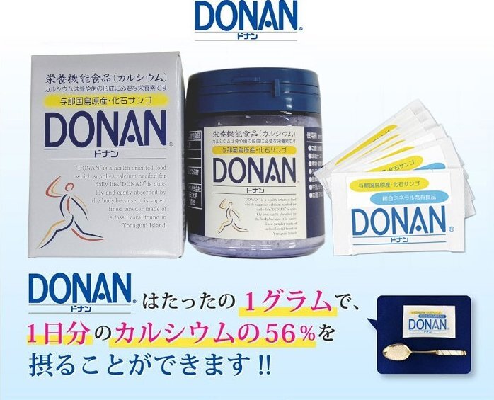●カルシウムを含めたミネラルの吸収率の良さが違う、無添加・未焼成の「化石サンゴの天然サプリメント」総合ミネラル含有食品『DONAN』。必須ミネラル16種を含む、計70余種類のミネラルがとれます。DONANは「化石サンゴ」をカラダに必要なミネラルを摂取しやすいミクロの粉末にし、日常の食事や飲み物に混ぜることで、カルシウムとミネラルを補給します。