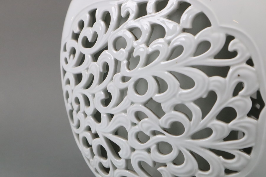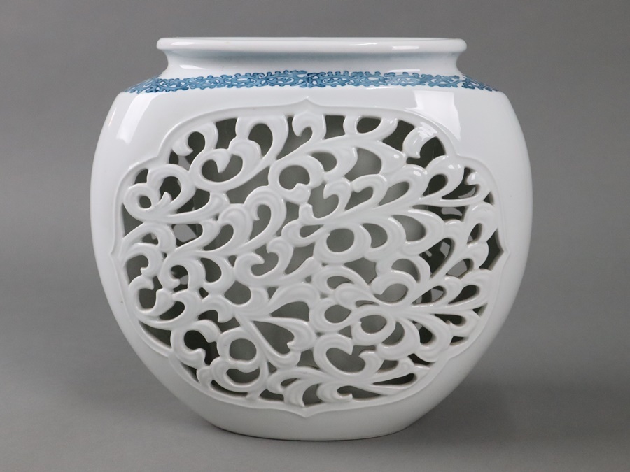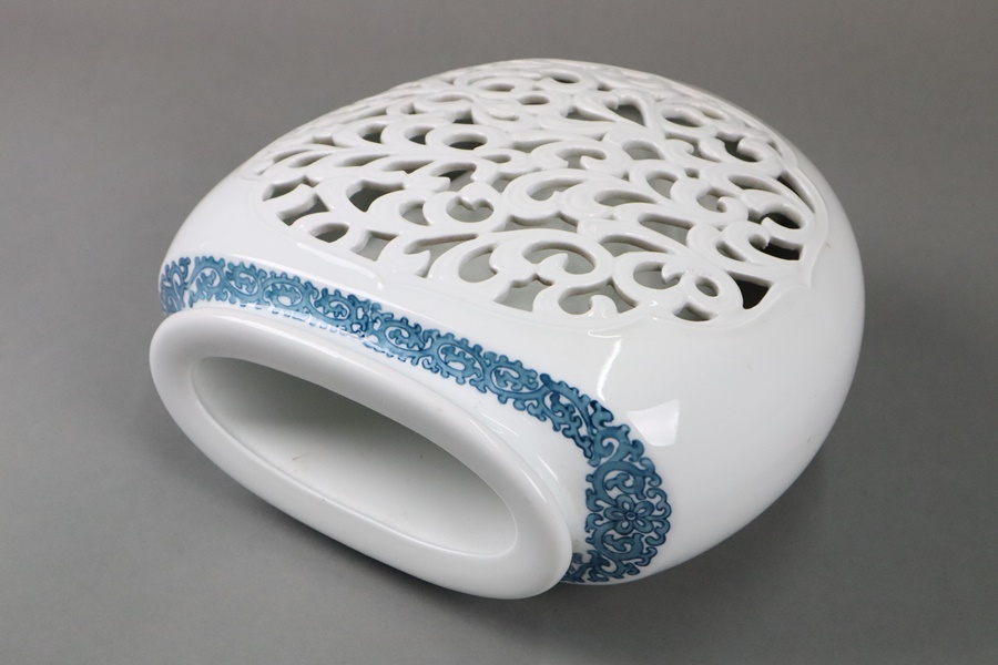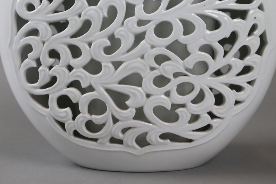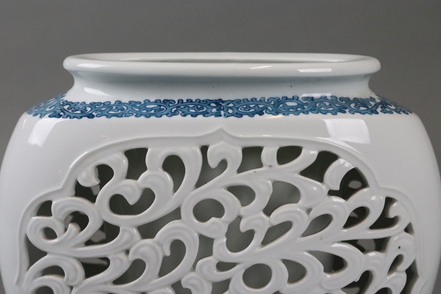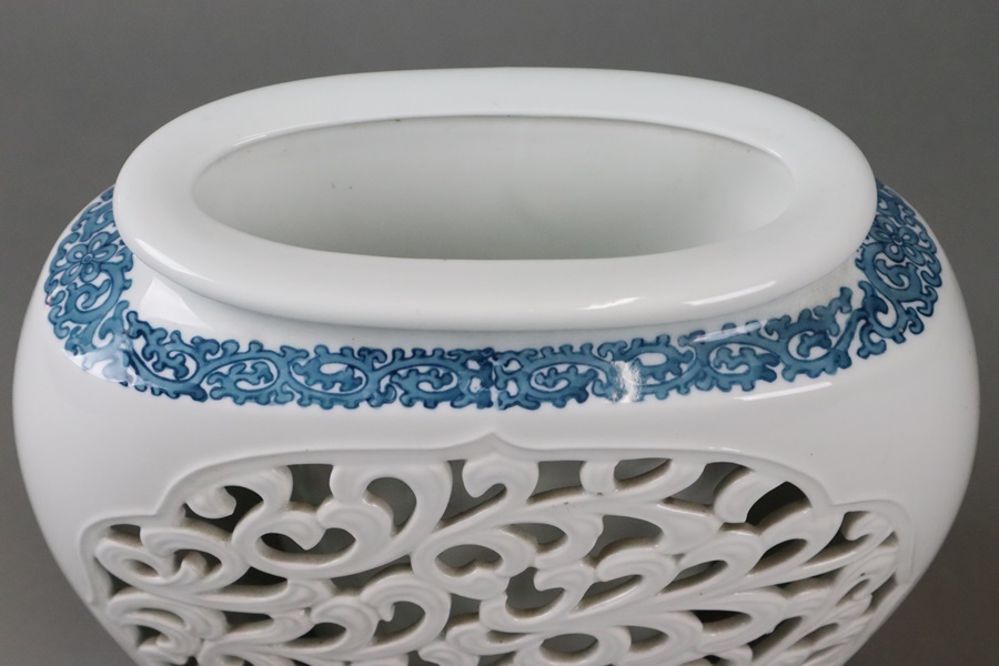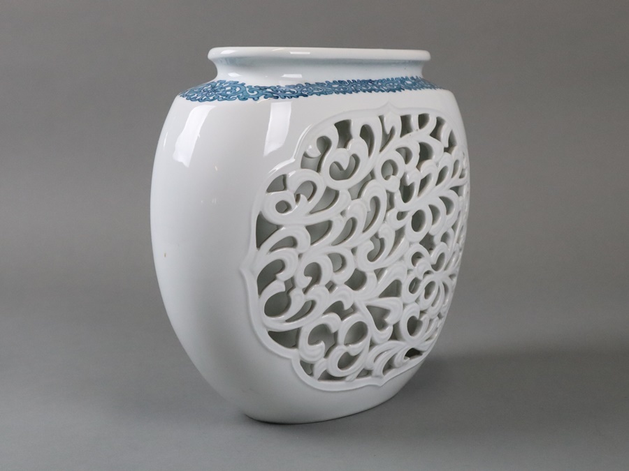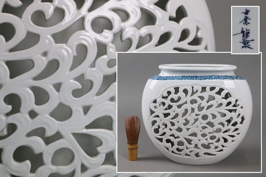 有田焼 寿窯 龍泉作 染付 陽刻透花瓶 高24cm 幅27,5cm 白磁 花器 細密細工 古美術品[b1224]