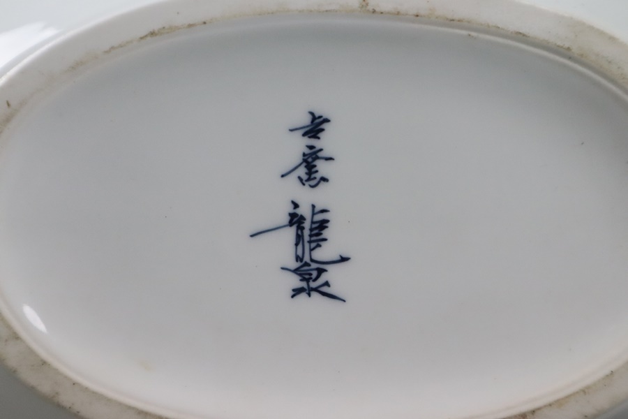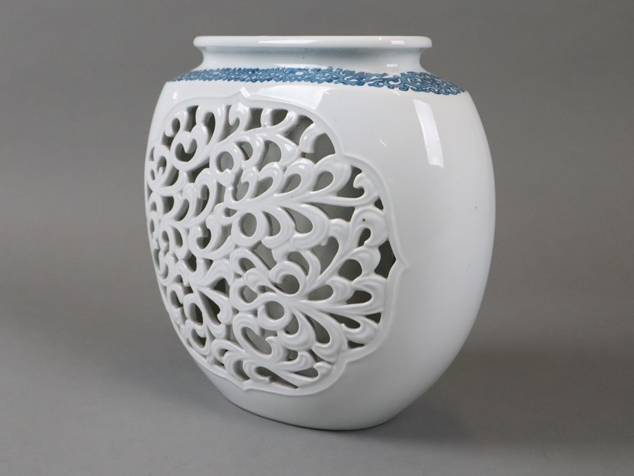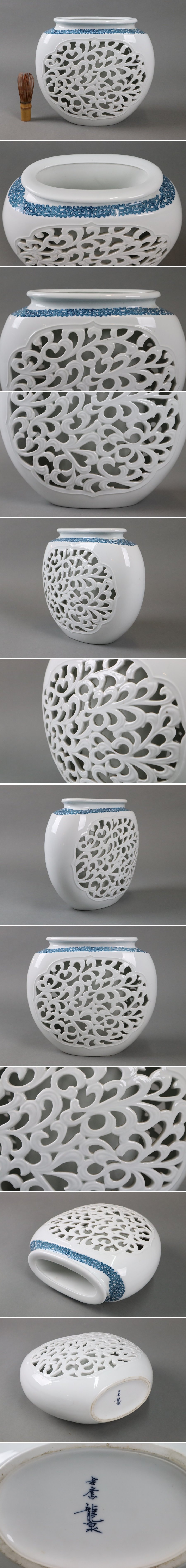 【有田焼 寿窯 龍泉作 染付 陽刻透花瓶 高24cm 幅27,5cm 】