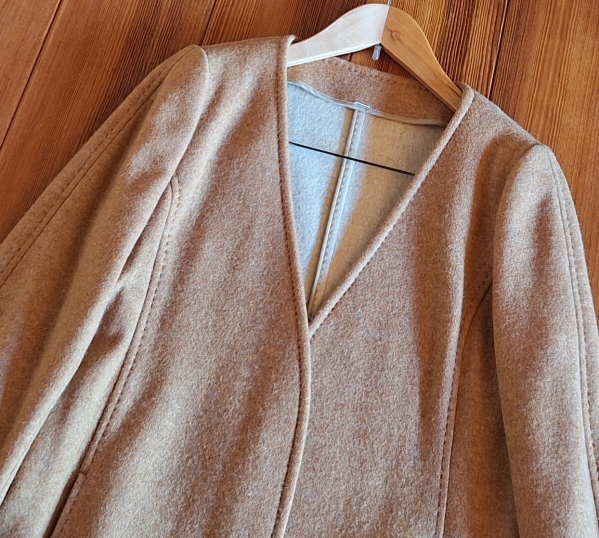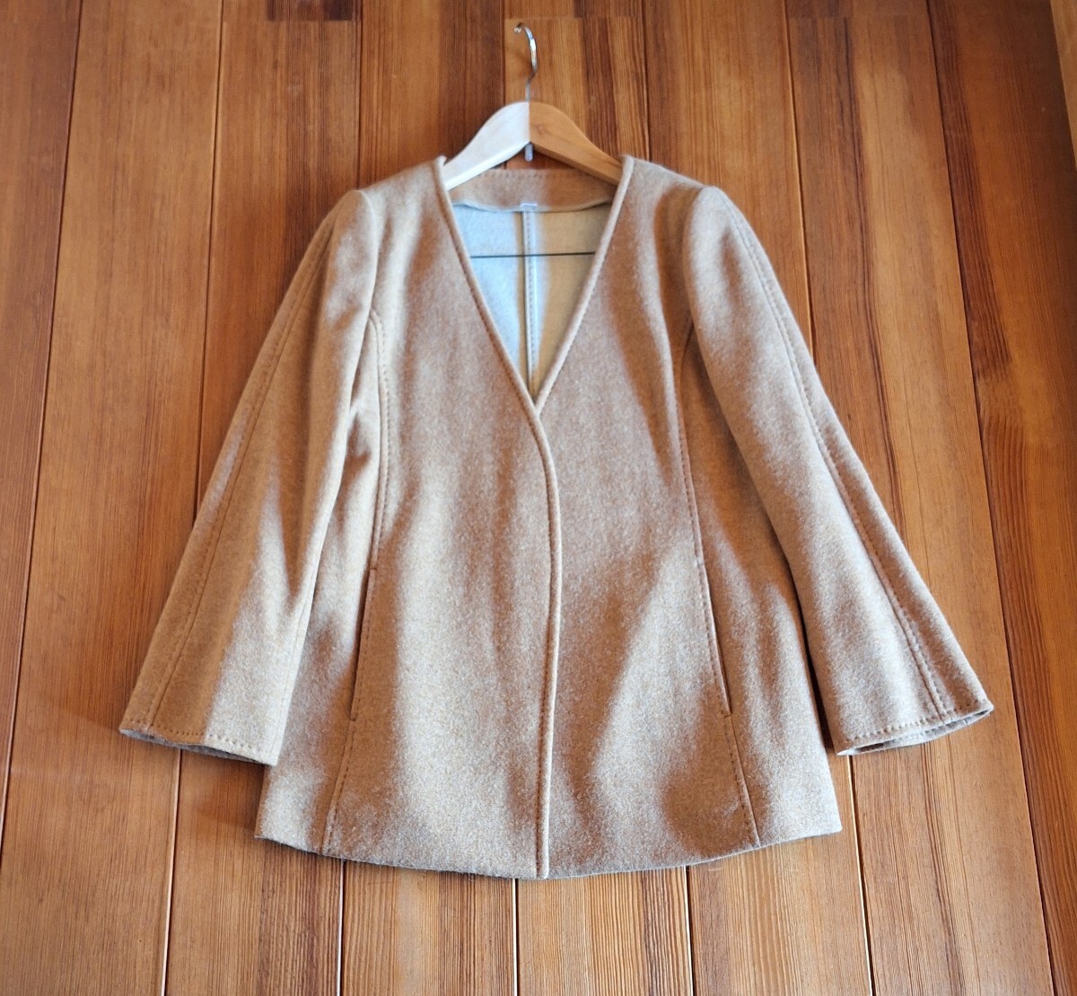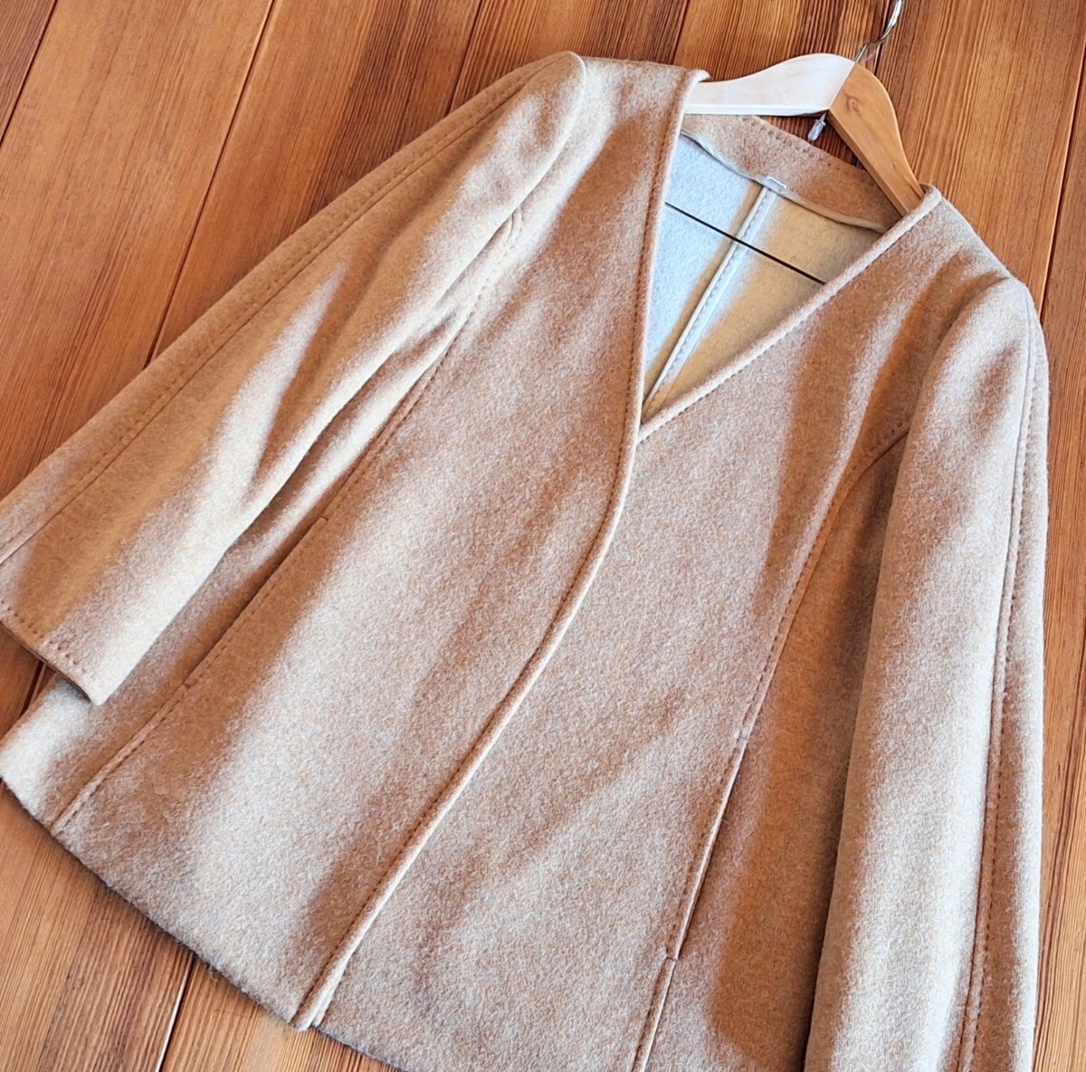 ★発送方法★首回りスッキリのVネックでボタンはなく着流しジャケットになります上質は素材で高級感があります綺麗な着用ラインでキャメルカラーは上品に見せてくれるお勧めのジャケットです画像は若干薄いお色で写っているかもしれません多少の毛羽たち感はございますが目立つ大きな難はなく全体的には良好です※実物に近いお色が出るように撮影しておりますがモニター環境により相違が生じる場合がございますのでご了承くださいませクリーニング済みです保管や洗濯によるしわについてはご容赦ください完璧をお求めの方、神経質な方はご遠慮くださいませ中古品をご理解いただいて入札をお願い致します【サイズ】 9【実 寸】 肩幅:37cm 身幅:約48cm 袖丈:約58cm 着丈:約67cm(襟下後ろ中心)【素 材】 表地:毛80% ナイロン20% 袖裏:キュプラ97% アセテート3%※素人の平置き採寸になりますので多少の誤差はお許しください