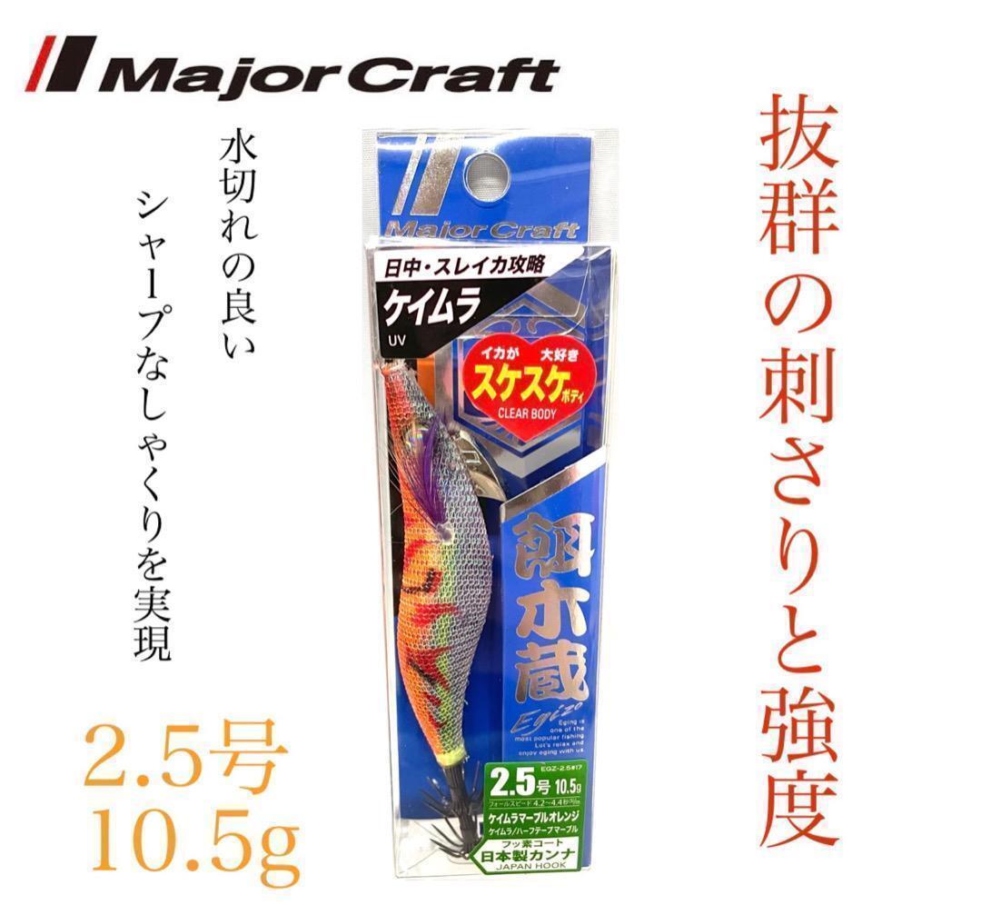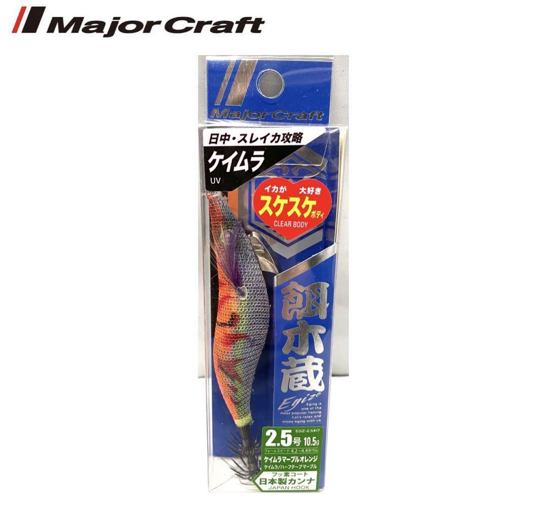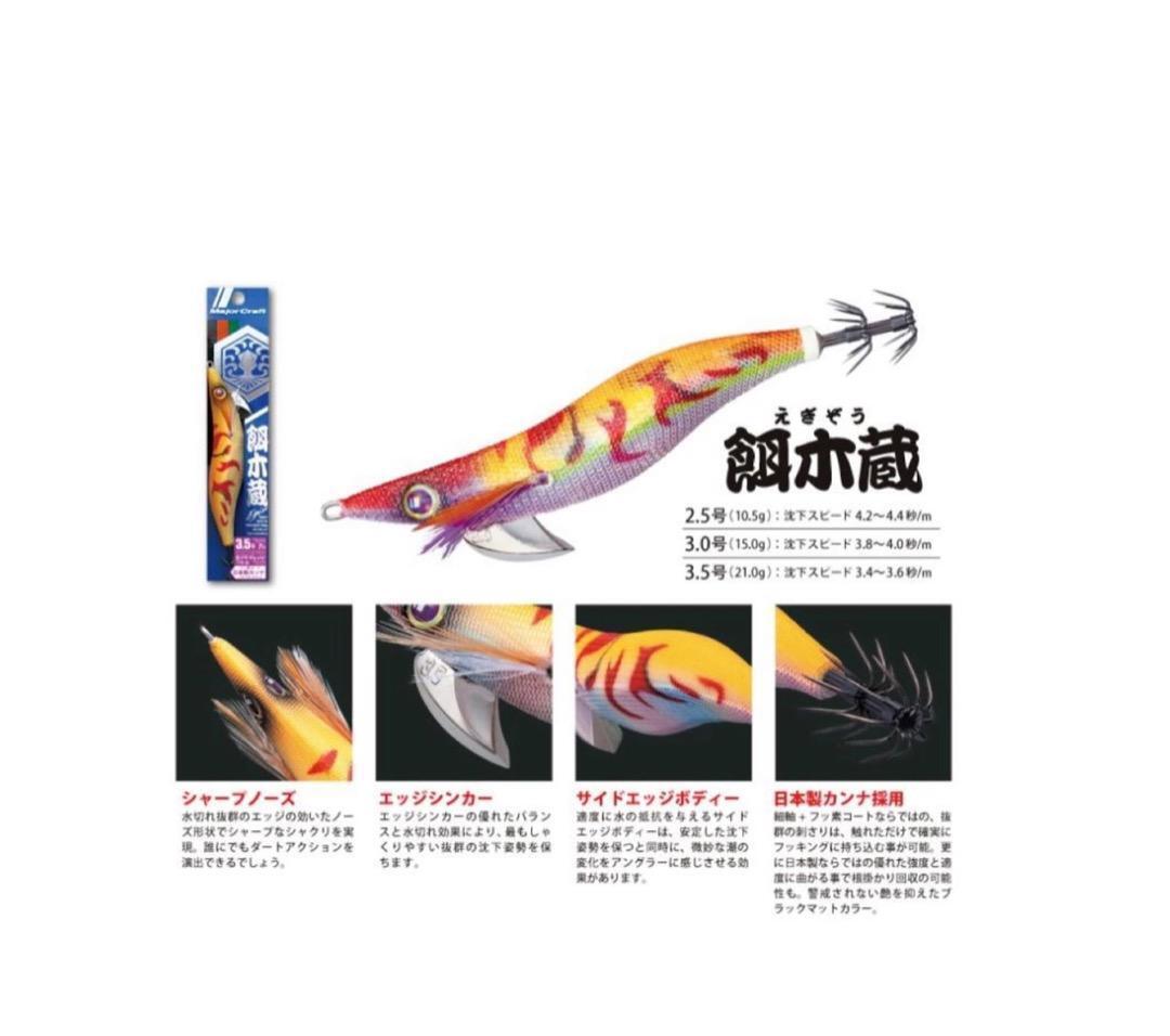 メーカー:メジャークラフト 商品名:餌木蔵 2.5号 10.5g 沈下スピード:4.2〜4.4/秒 エッジシンカーの優れたバランスにより、最もしゃくりやすい沈下姿勢を保ちます。 また、本体サイドエッジ、シャープノーズ、エッジシンカーの相乗効果により水切れの良いシャープなしゃくりを実現しました。 イカを乗せやすく、掛けやすいバランスに設計されています。 細軸+フッ素コートならではの、抜群の刺さりと強度を持った日本製カンナは、イカに警戒されないツヤを抑えたブラックカラーフィニッシュを採用しました。 商品コード:4573236185859 474 0.7