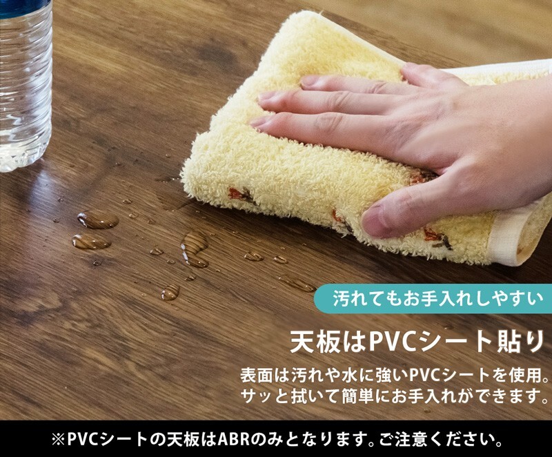 | 材質 | 天板:天然木化粧繊維板 OAK:オーク突板(ラッカー塗装)/ WAL :ウォールナット突板(ラッカー塗装) ABR:合成樹脂化粧繊維板(PVCシート張り) 脚:スチール(エポキシ粉体塗装) |