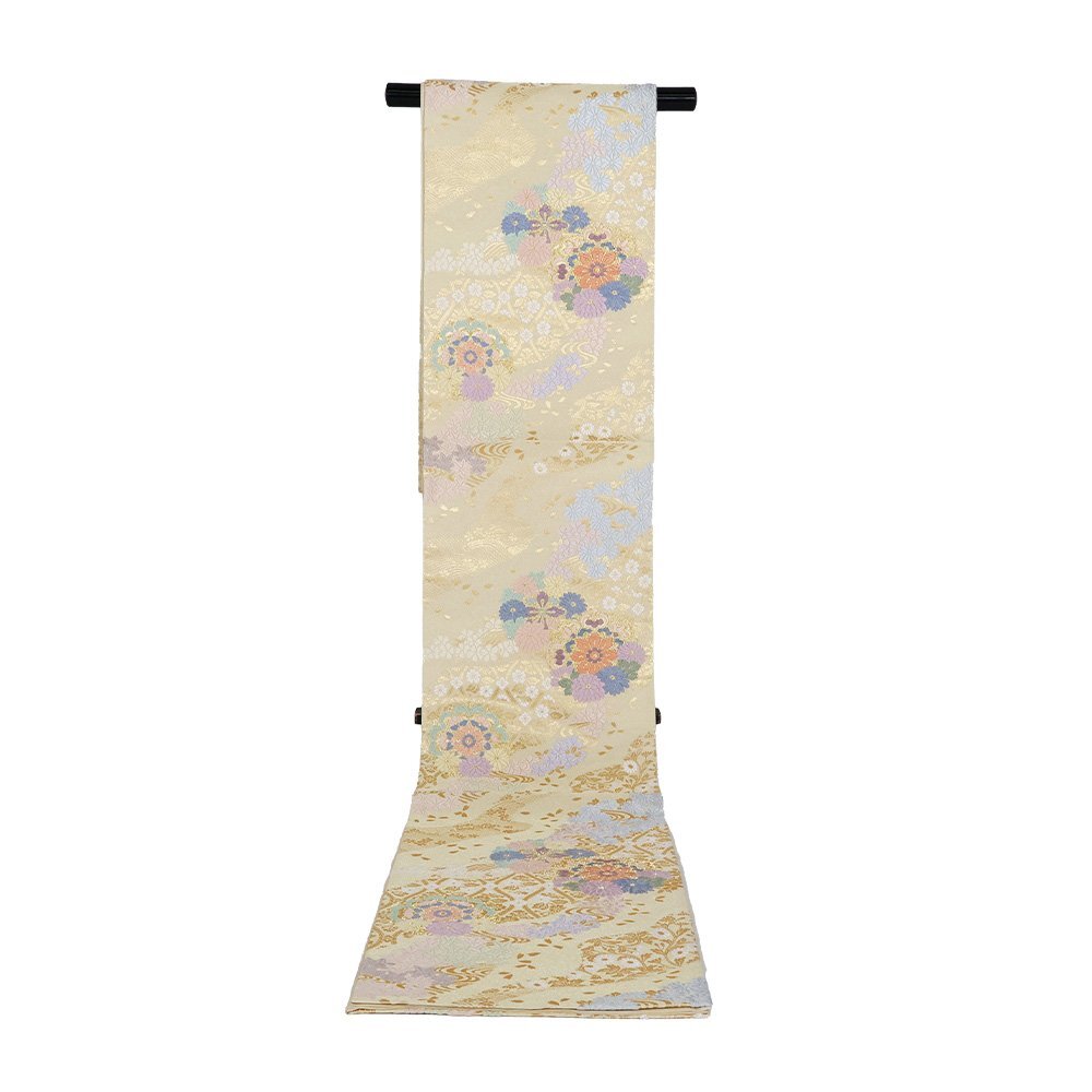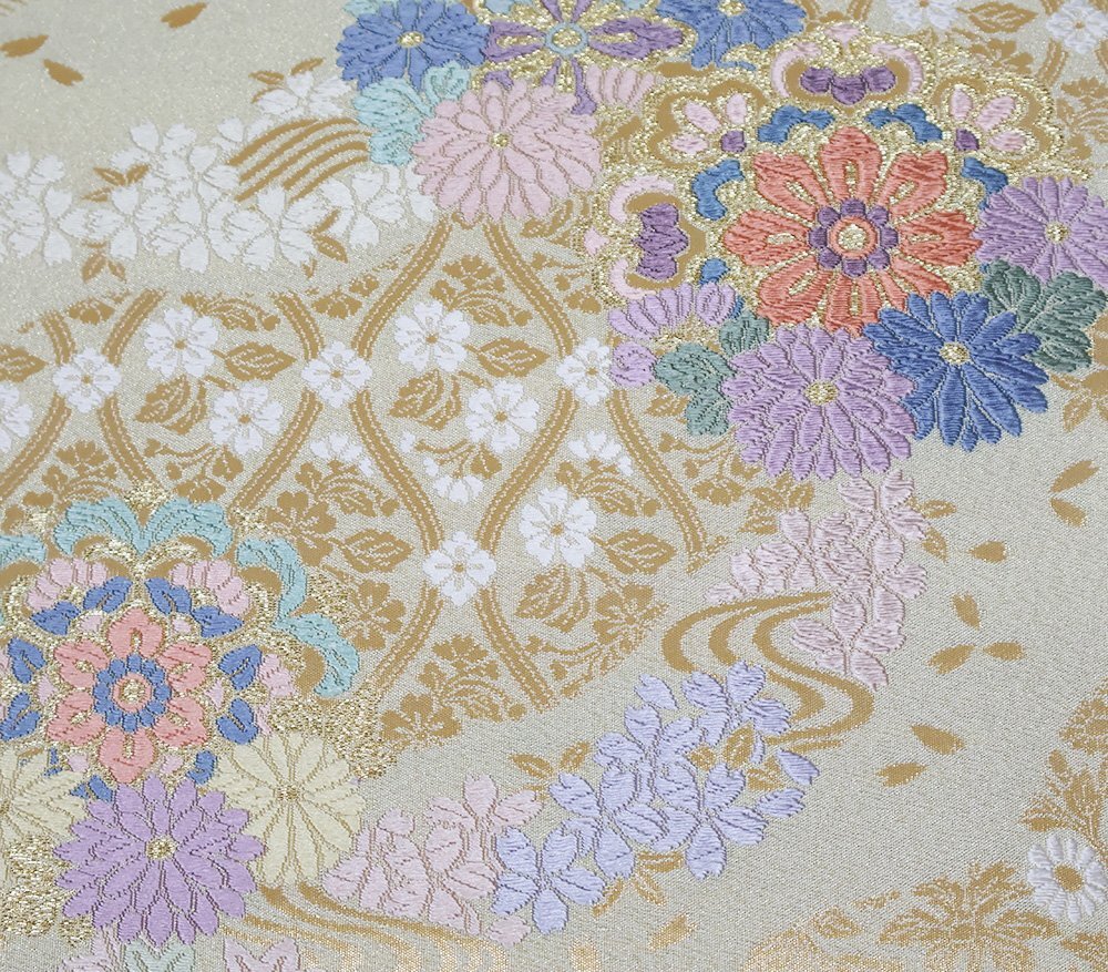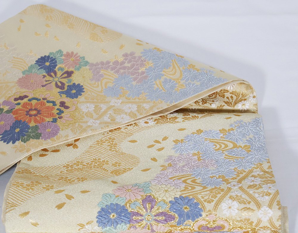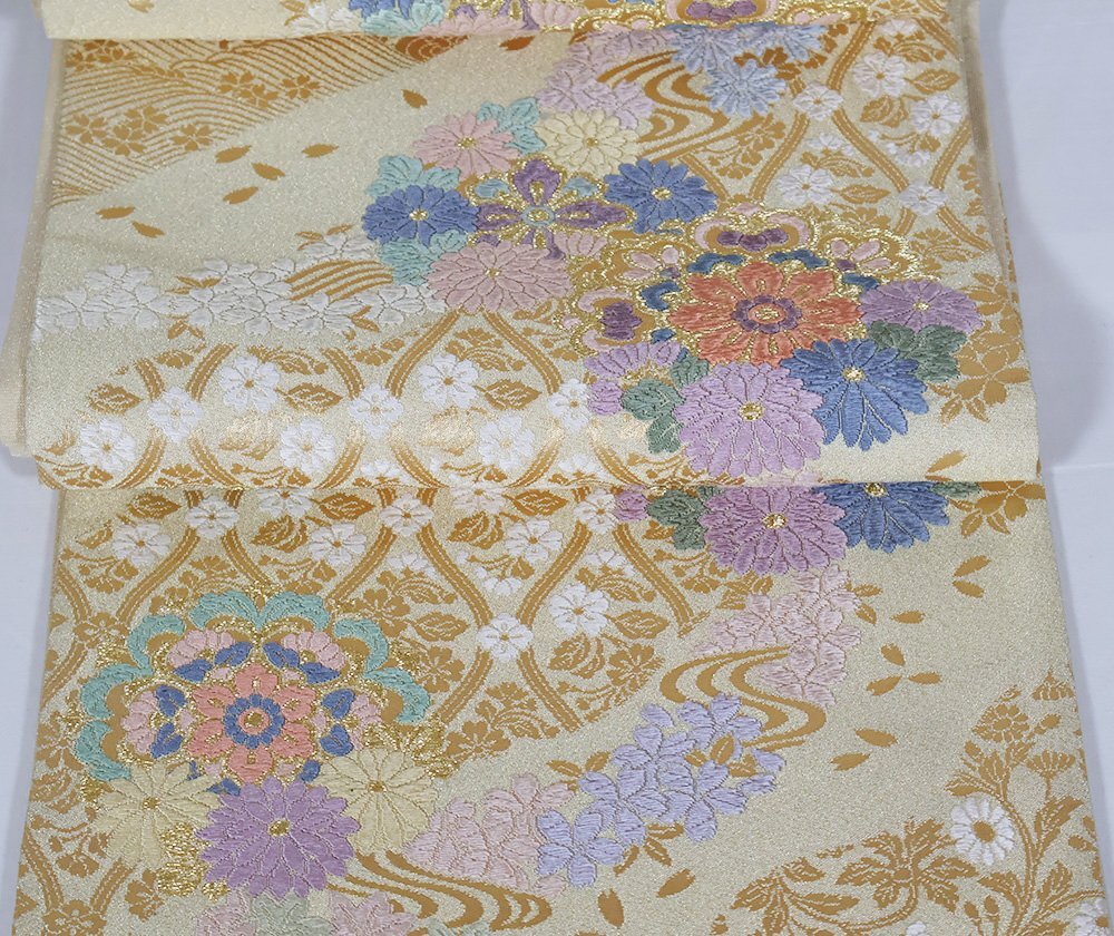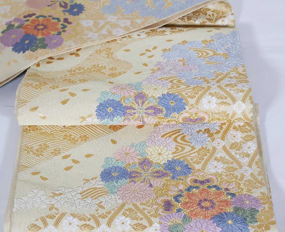 | 西陣織袋帯 つづれ 西陣 ベージュ・金・金箔地 唐織・華文・桜・菊 金箔・桜花びら 新品 仕立て上がり |