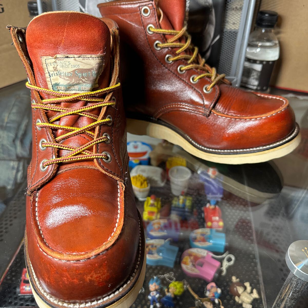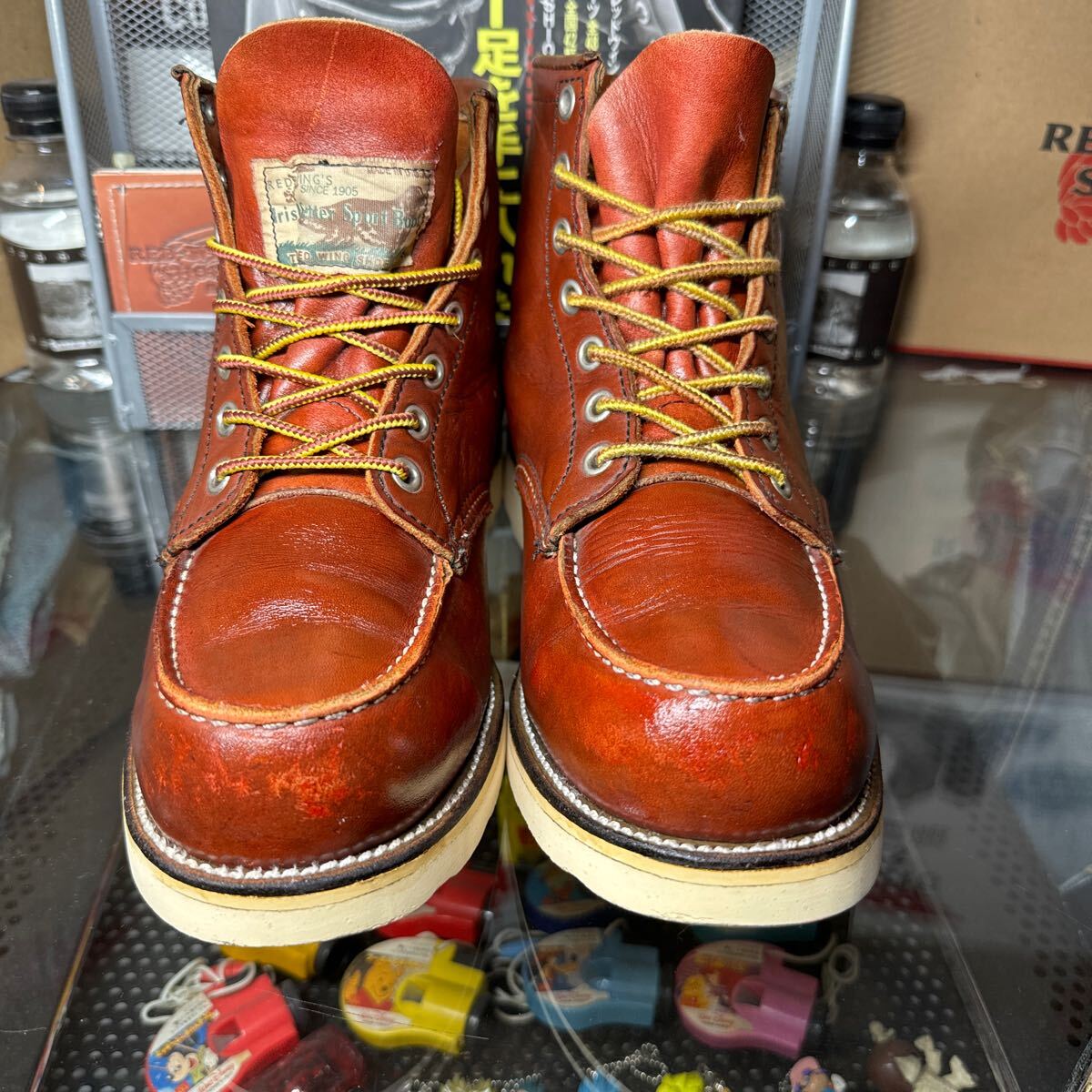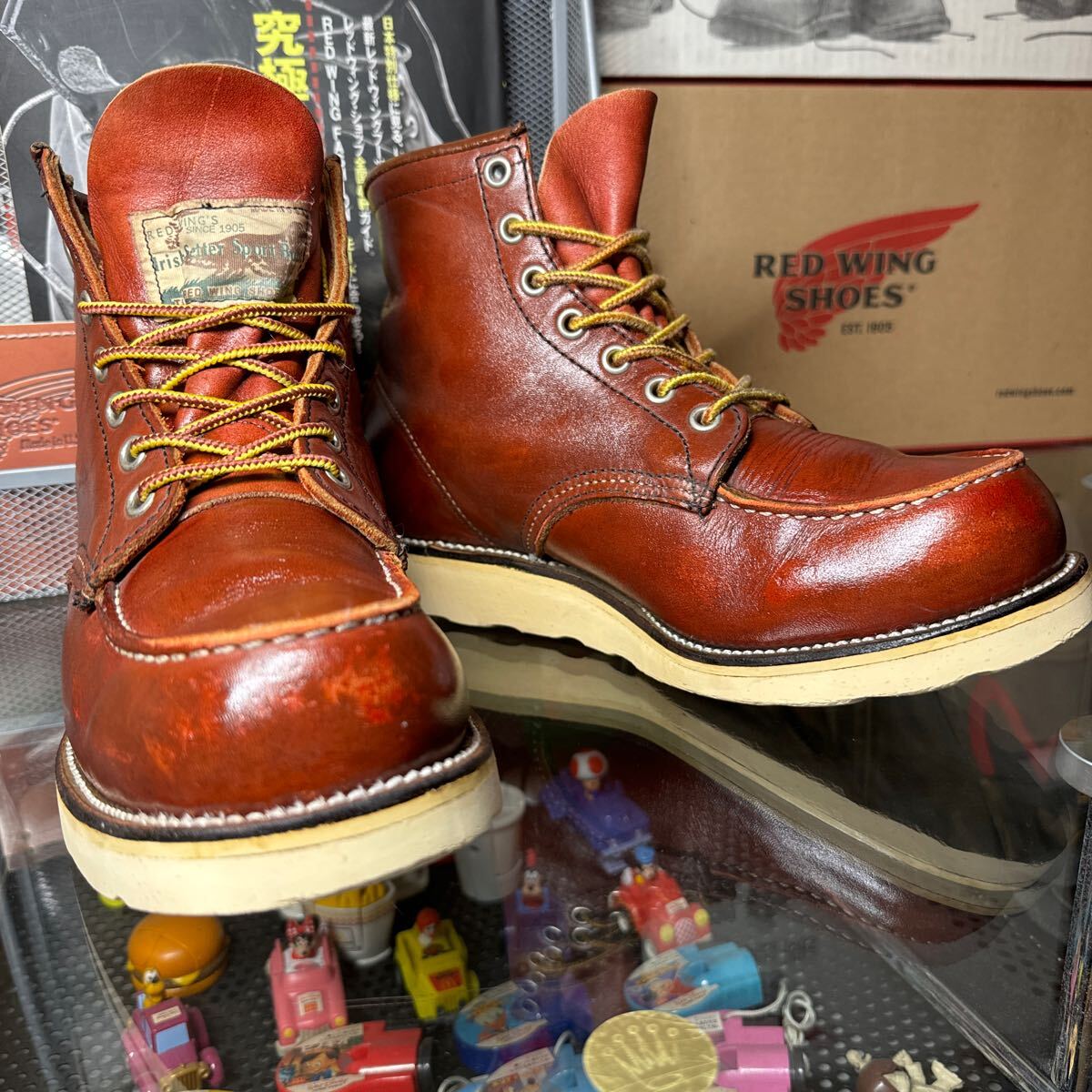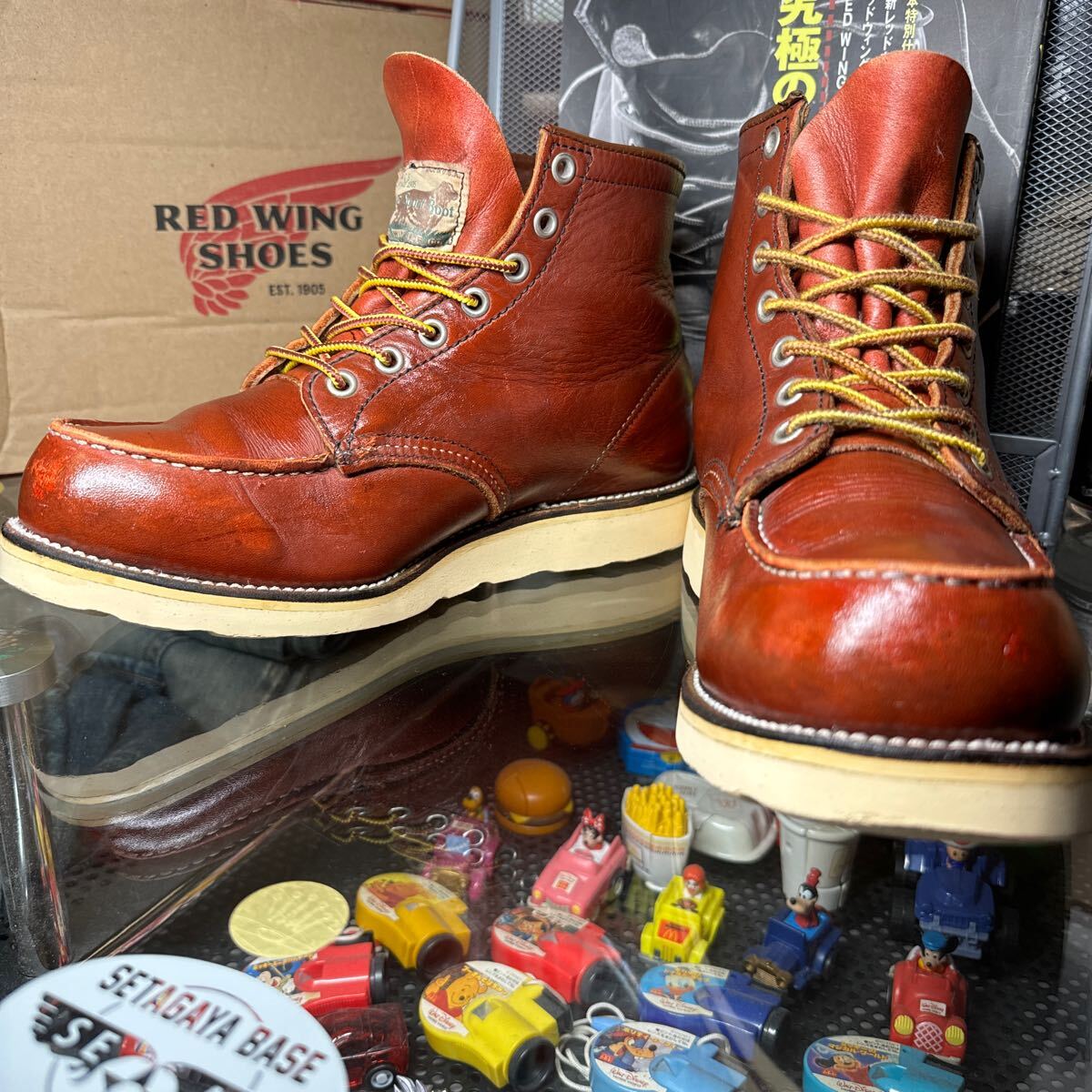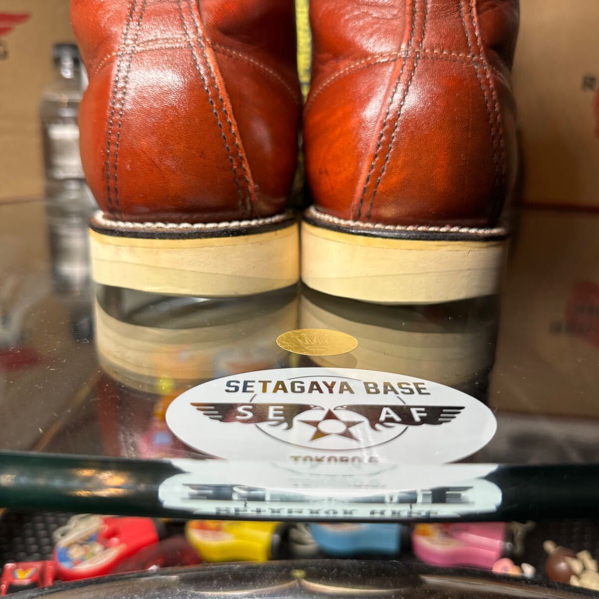 当商品は非常に人気のある90'sに生産された、独特の赤茶色が特徴のレッドウィング です。しかも右足タンの表に四角犬タグが刺繍された超生産量の少ないモデルになります。