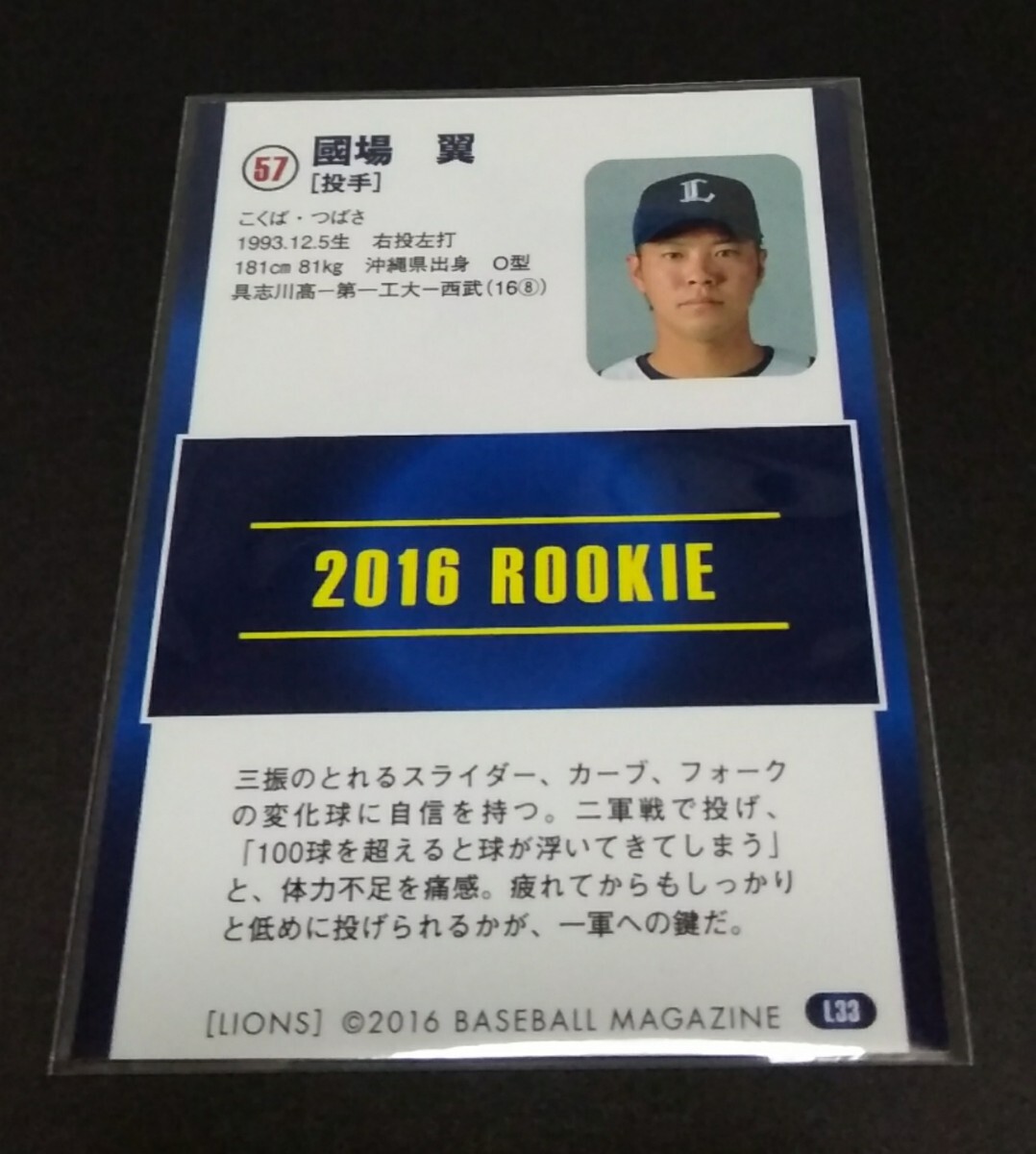 2016年BBM ライオンズ 國場翼(西武)ルーキーカード!No,L33。
