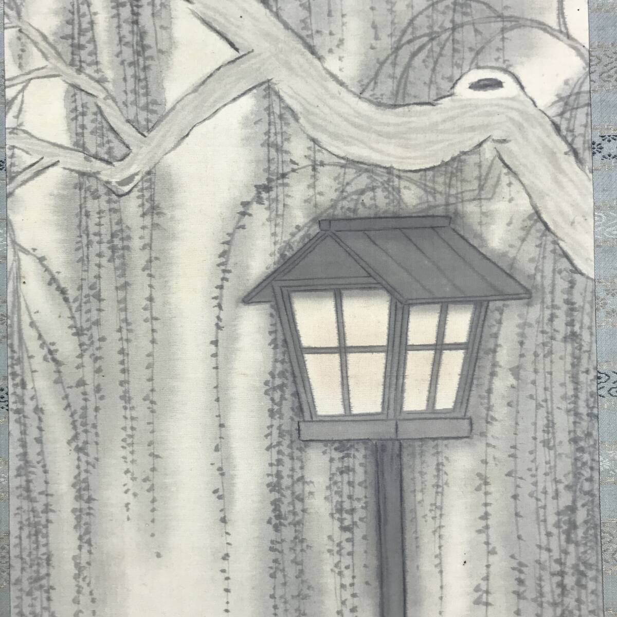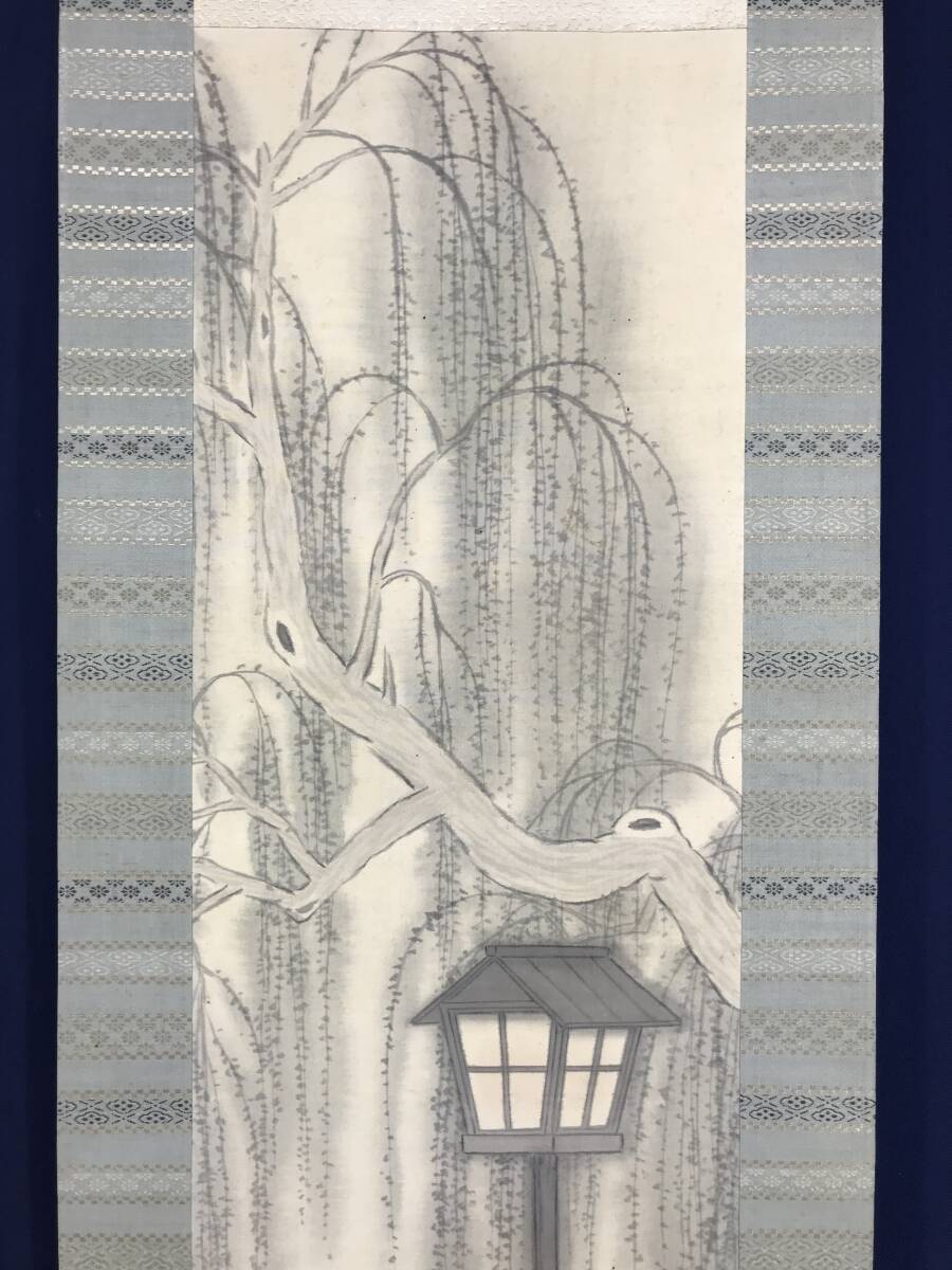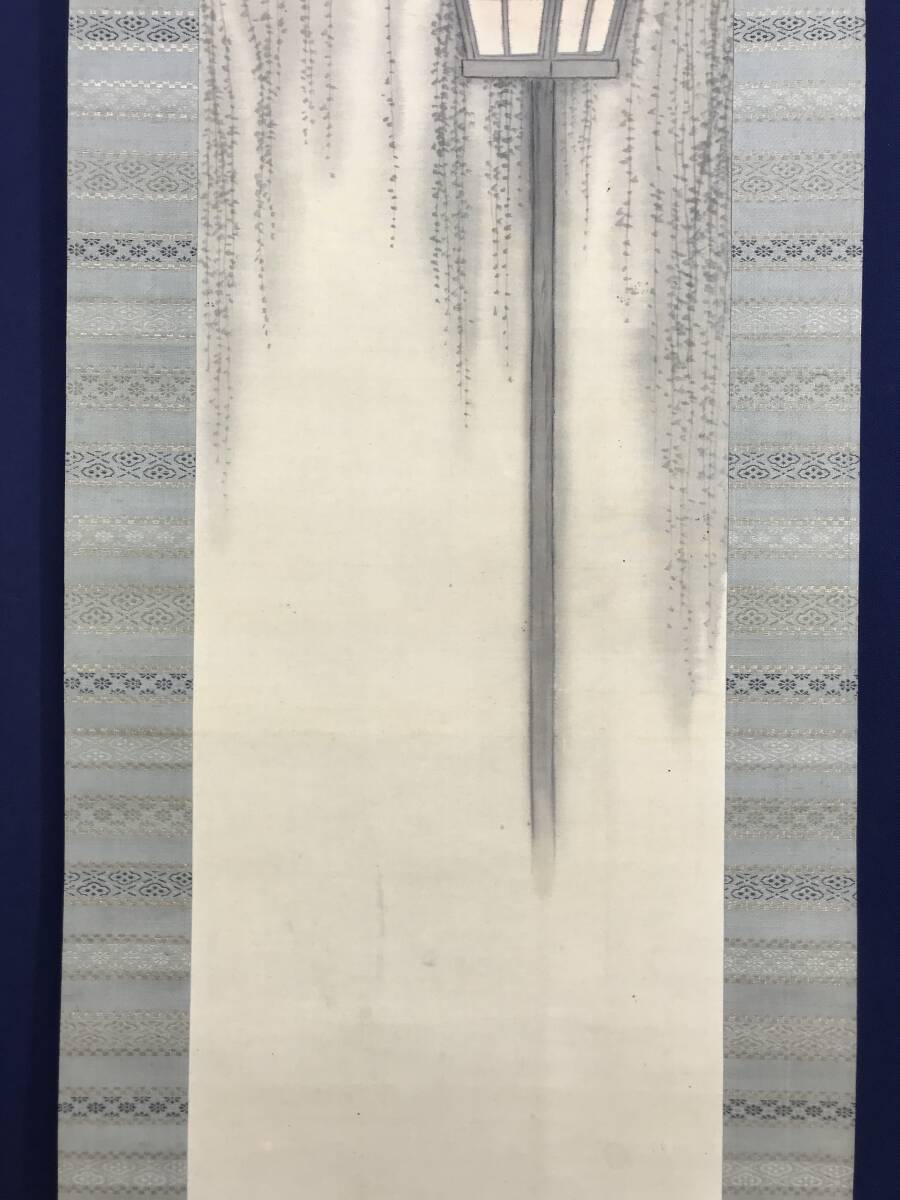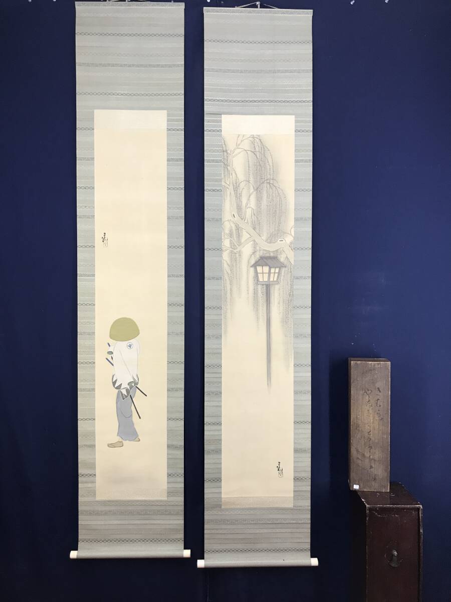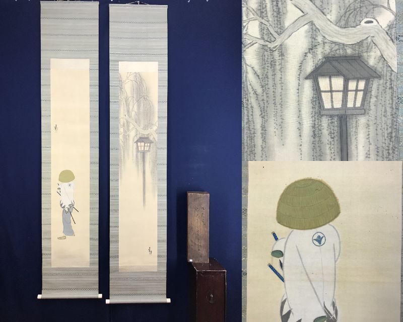真作/草挙/柳に灯篭侍之図/双幅/掛軸☆宝船☆AF-526