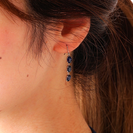 オーバルカット(小判型)に仕上げた4x6mmの大粒の含侵サファイア各0.50ctx3石、計1.50ct。両耳で合計3.00ctのゴージャスなモチーフが、縦に3石並んで耳元でゆらゆら揺れる存在感のあるフックピアス!!
