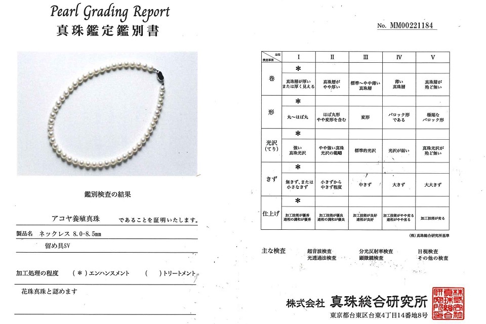 | 付属品 | 宝石鑑別書(真珠総合研究所) ※販売価格が121,000円以上の商品については宝石鑑別書を付けて納品致します。但し、作品の材質や構造の理由で一部商品にはお付けできませんので、予めご了承ください |