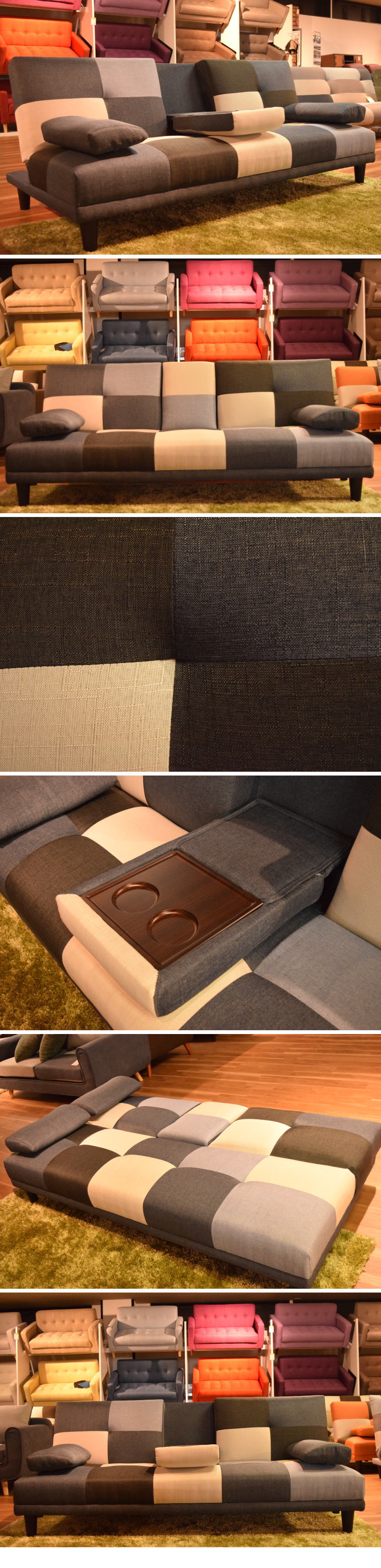 | 【限定送料無料 新品 展示処分品】テーブル付 カラフル布製 パッチワーク ソファーベッド 3人掛け |
