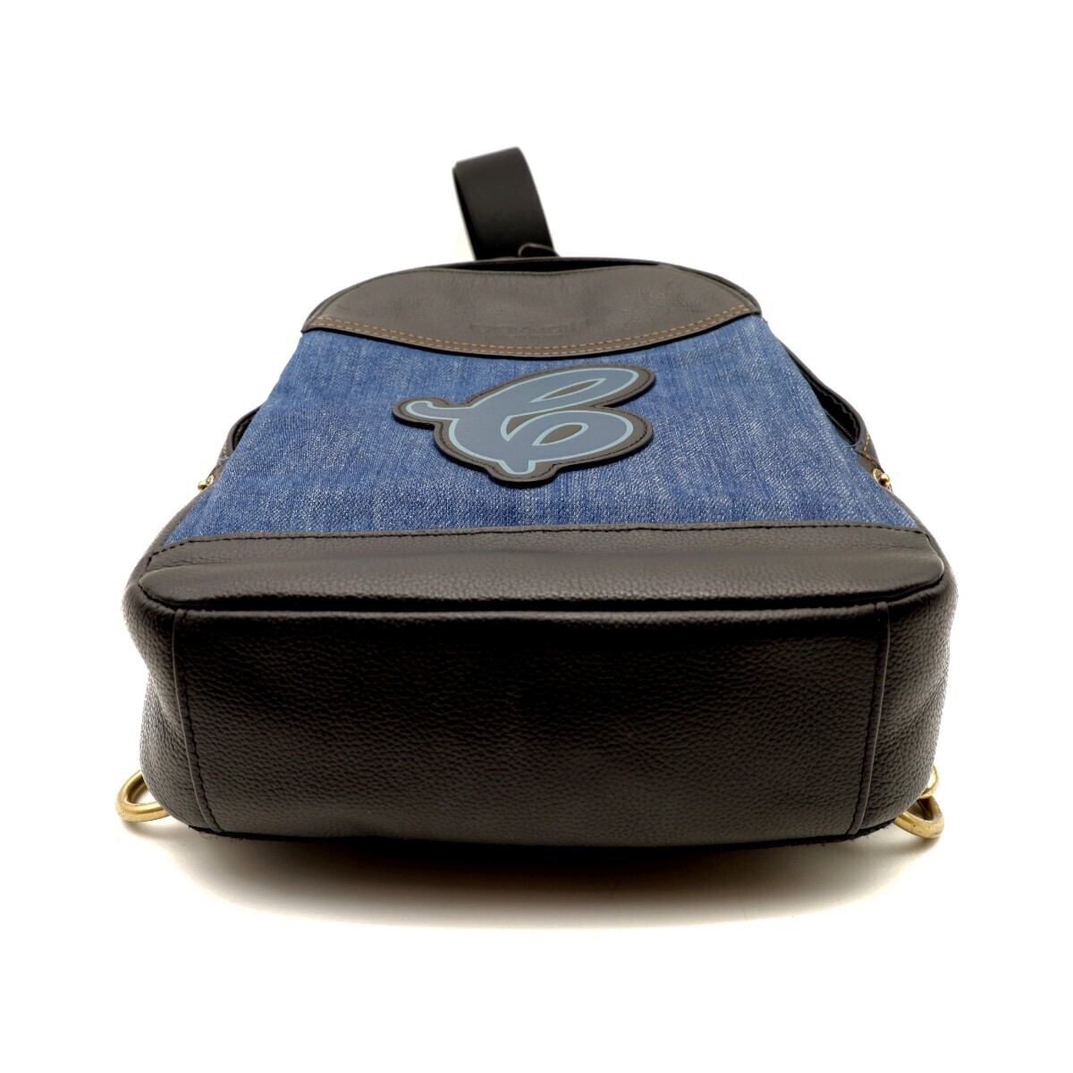 丈夫なデニム生地と上質なレザーの組み合わせが、独特の風合いを演出。流通量の少ない希少なモデルで、フロントの大きな「C」ロゴがアクセントになっています。