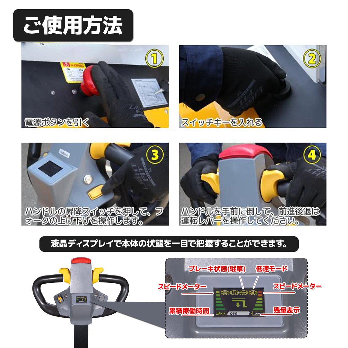 ●走行、後進、昇降ともに電動式なので体への負担が軽く、女性でも楽々運搬ができます。