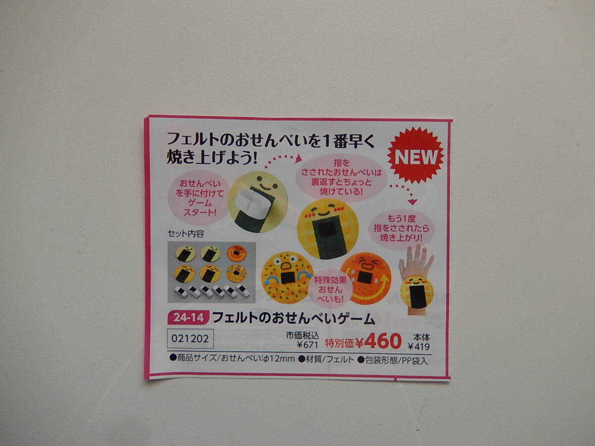 【商品について】21202★フェルトのおせんべいゲーム★フェルトのおせんべいを一番早く焼き上げよう!★おせんべいを手に付けてゲームスタート★指をさされたおせんべいは裏返すとちょっと焼けている★もう一度指をさされたら焼き上がり★特殊効果おせんべいもある★知育玩具★伝承玩具★