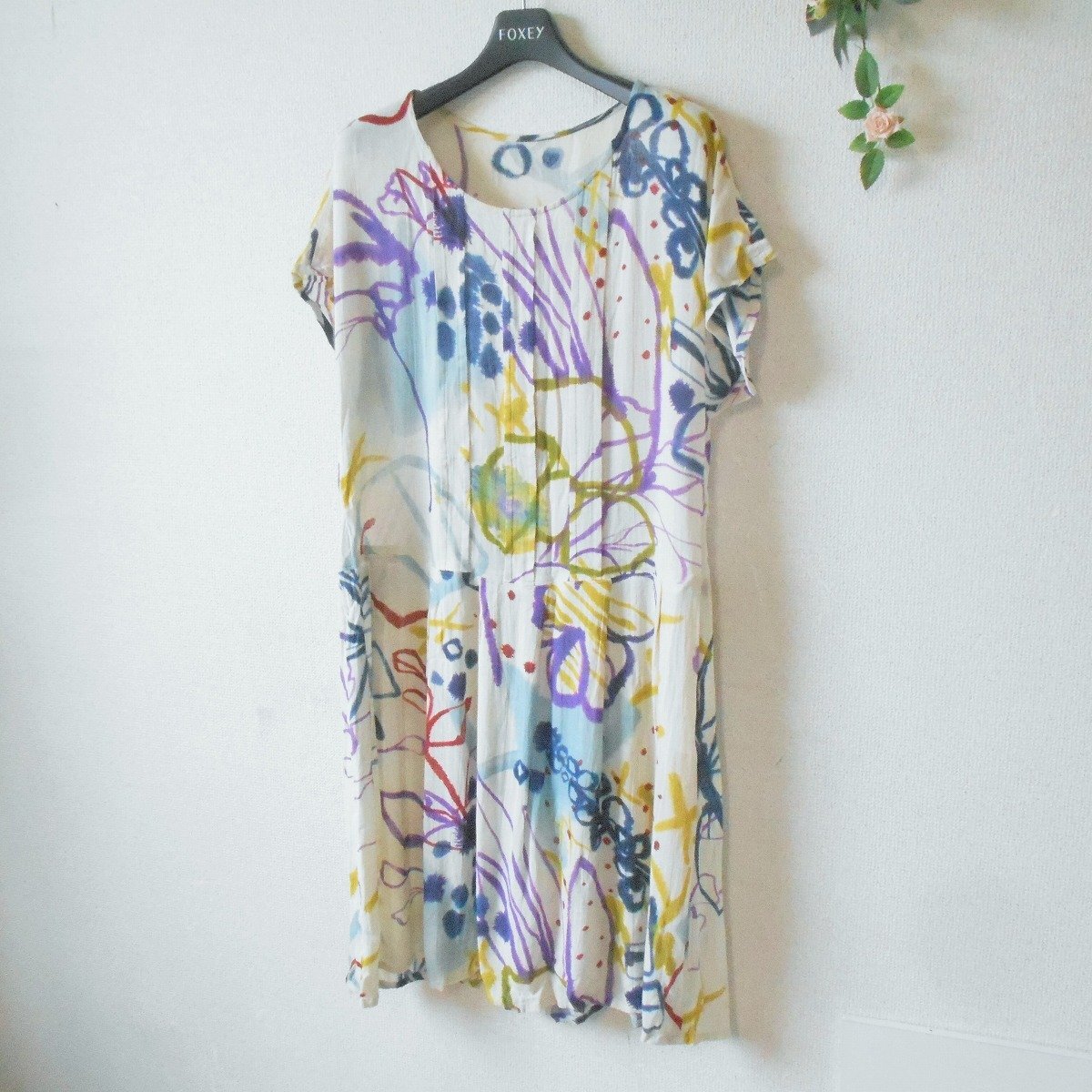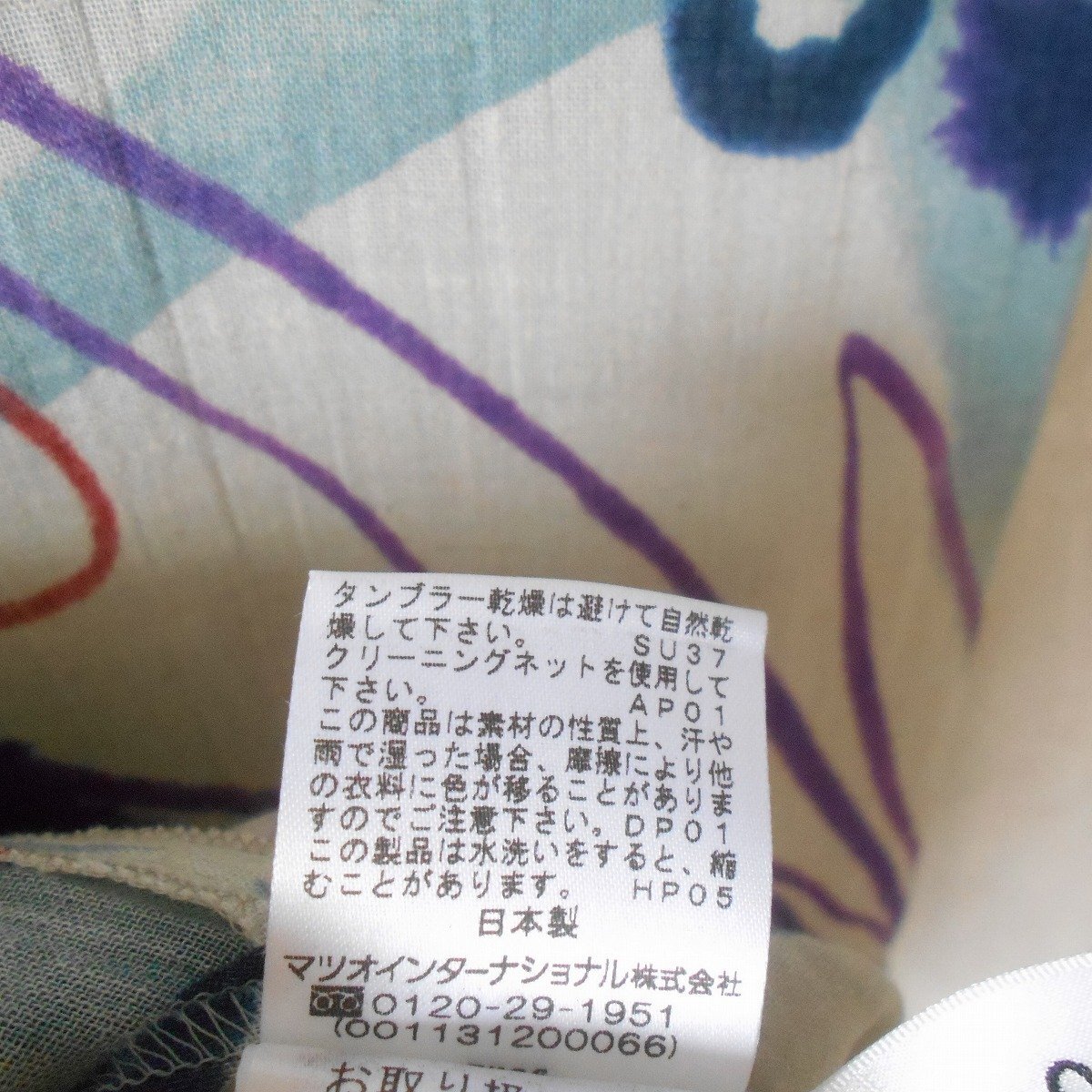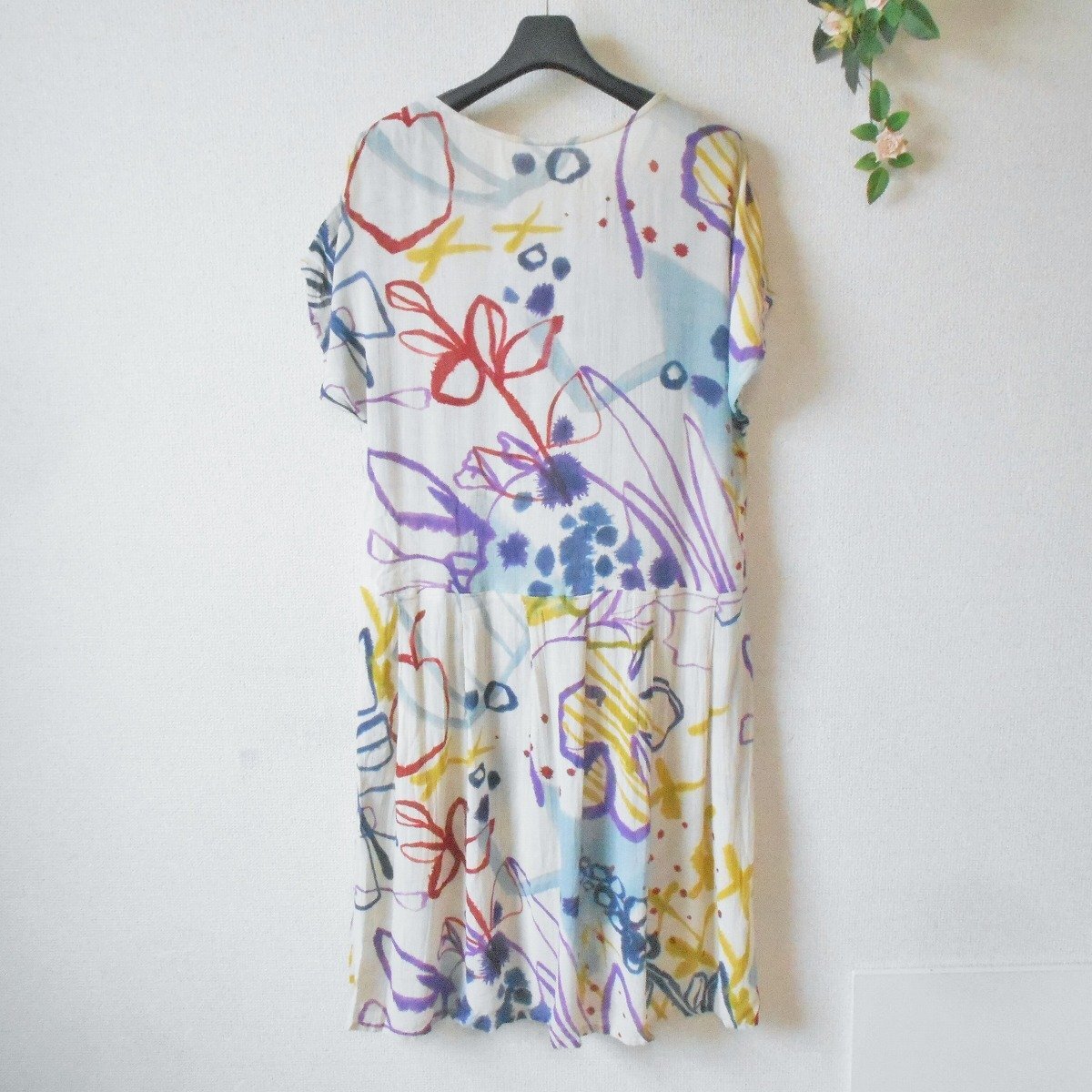 【ポイント】マツオインターナショナル、イオコムイオのワンピースになります。お色はキナリくらいの薄いベージュ系ベースで、多色使用の大胆な柄が全体に入っています。