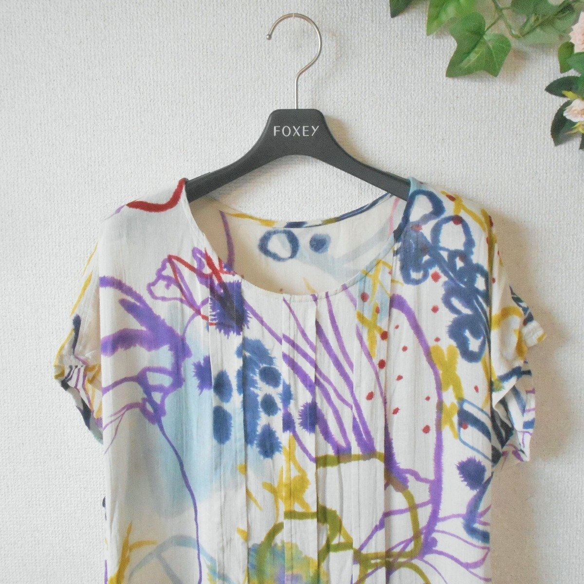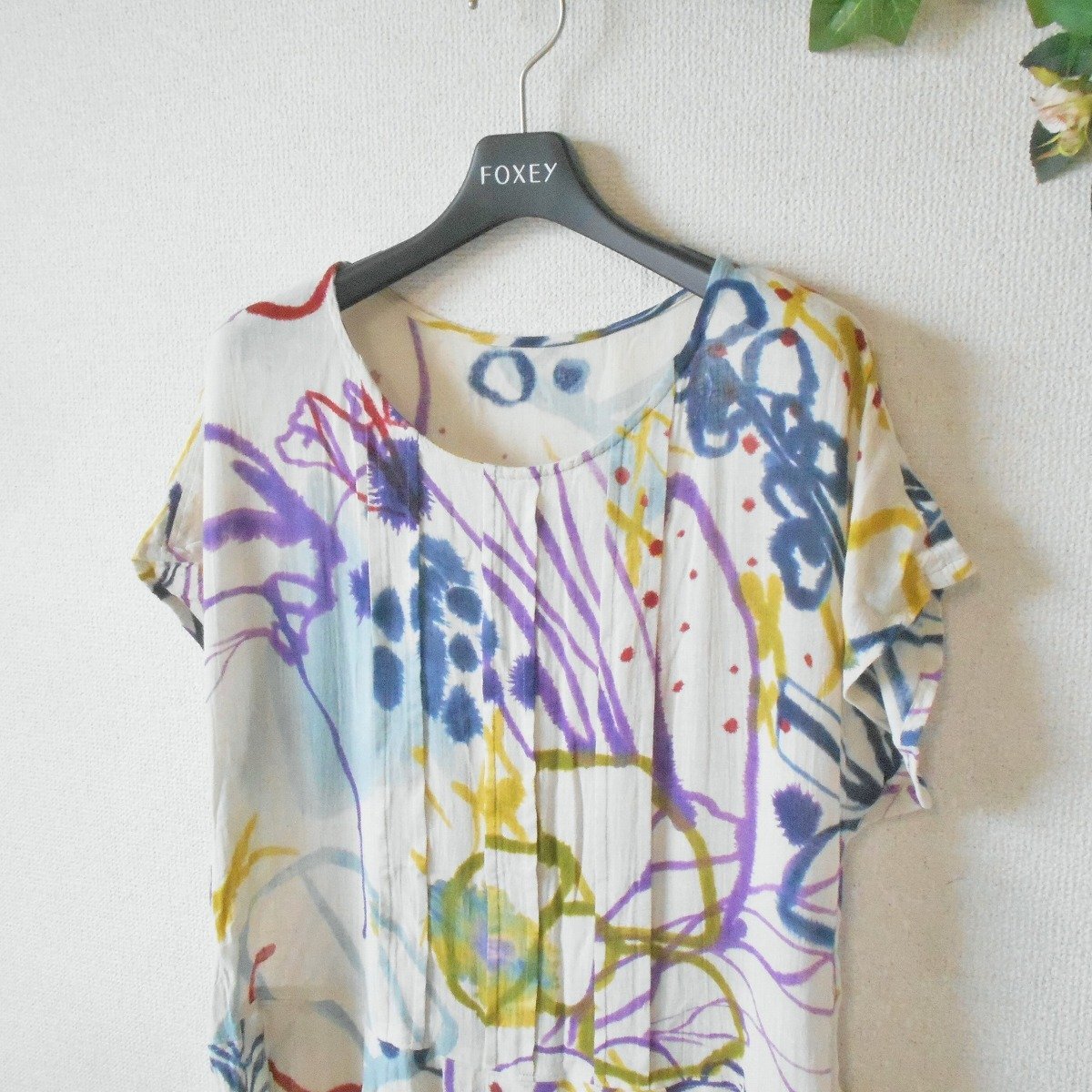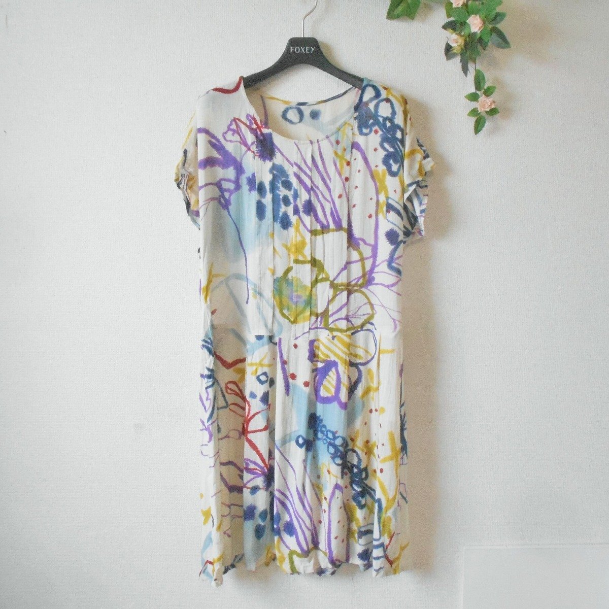 【ポイント】マツオインターナショナル、イオコムイオのワンピースになります。お色はキナリくらいの薄いベージュ系ベースで、多色使用の大胆な柄が全体に入っています。