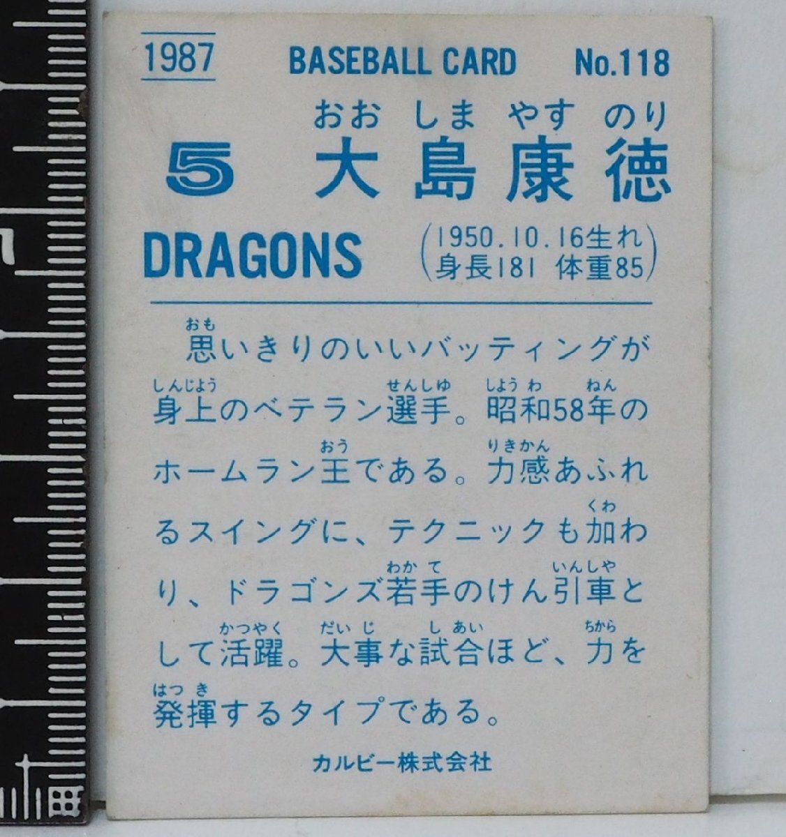 87年 カルビー プロ野球カード No.118【大島 康徳 中日ドラゴンズ】昭和62年 1987年 当時物 Calbee おまけ 食玩 BASEBALL【中古】送料込