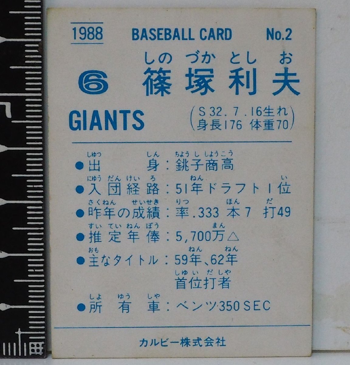 88年 カルビー プロ野球カード No.2【篠塚 利夫 読売ジャイアンツ巨人】昭和63年 1988年 当時物 Calbee おまけ食玩 BASEBALL【中古】送料込