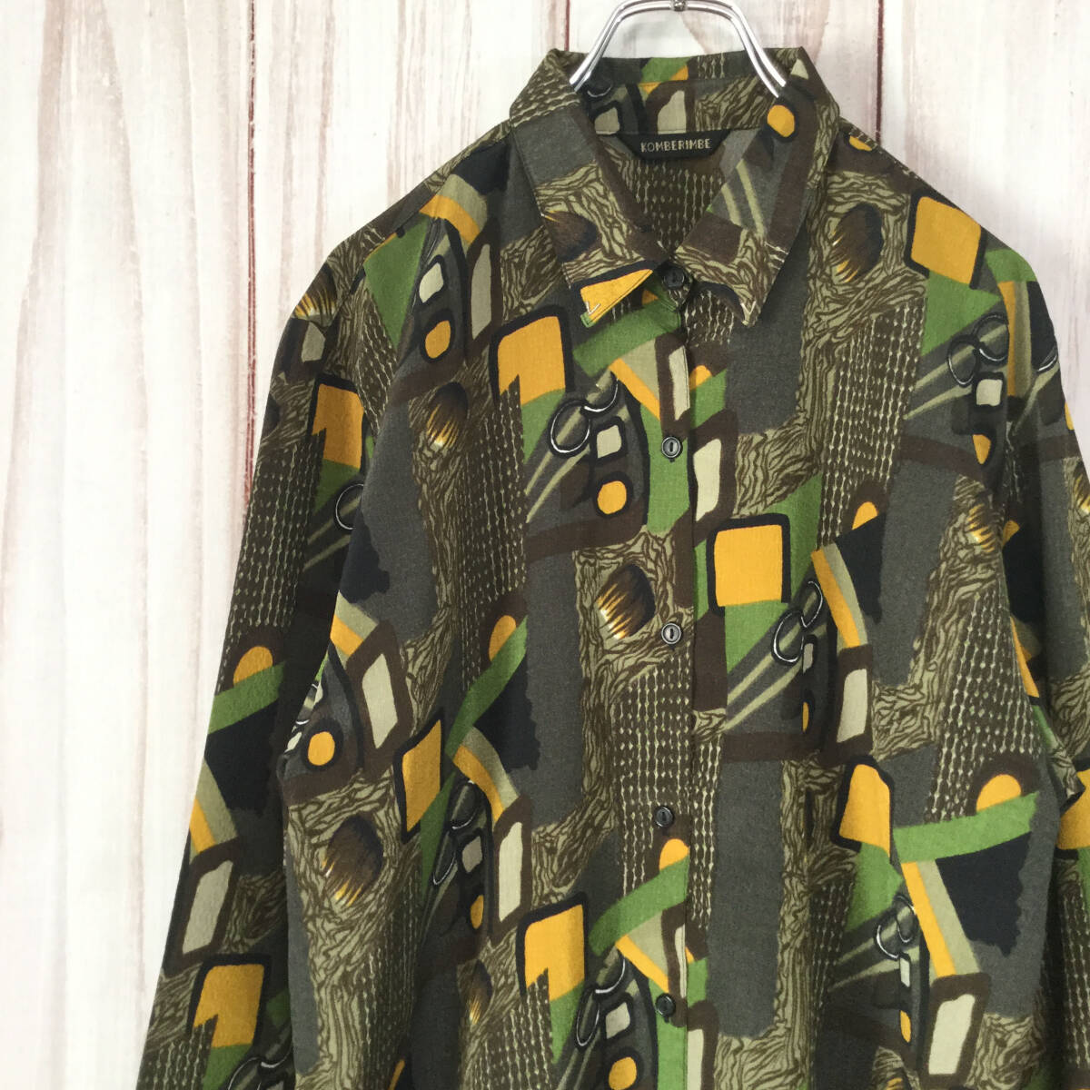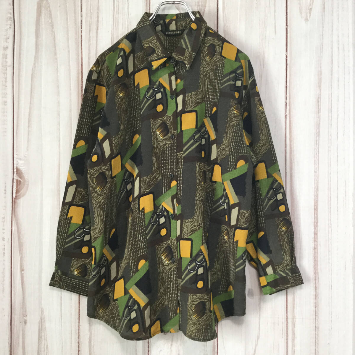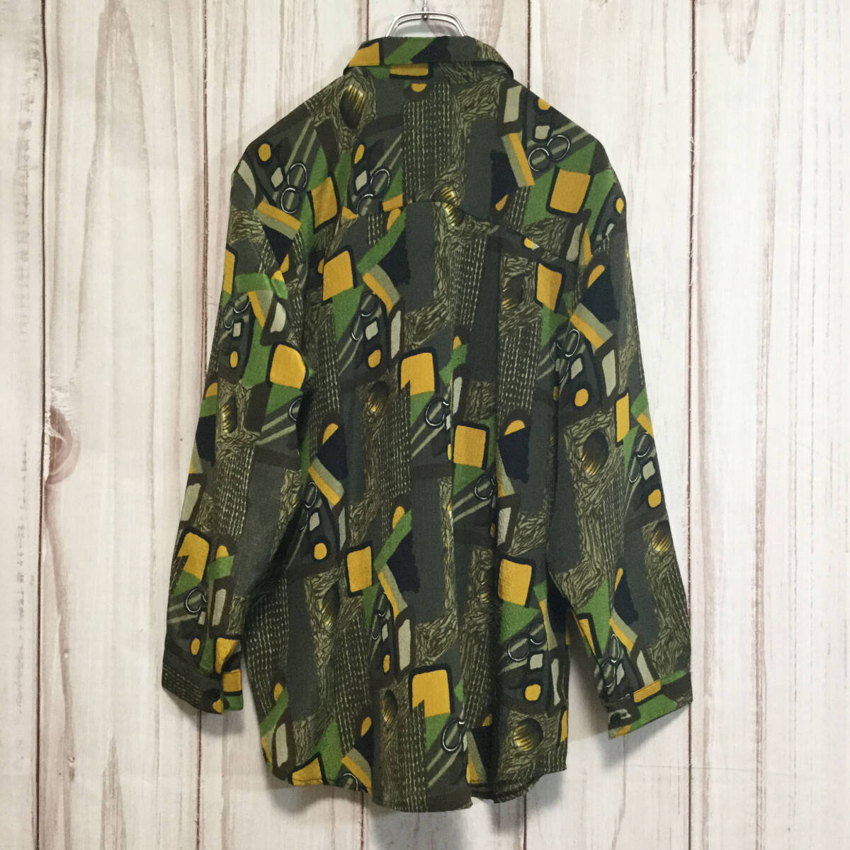 【長袖シャツ】 レトロ 総柄 アート柄 オーバーサイズ ダークカラー 光沢 L相当 ブラウン 古着 [231022-016]