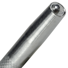 穴あけ加工を施したレザーの下から、凸の付いた部品(アタマ、ホソ)を通して台座に置き、出てきた凸部分に穴の開いた部品(バネ、ゲンコ)をはめ込み、打ち具を垂直になるような角度で当てて、打ち具の頭を木槌や金槌で叩くことで取り付けることができます。