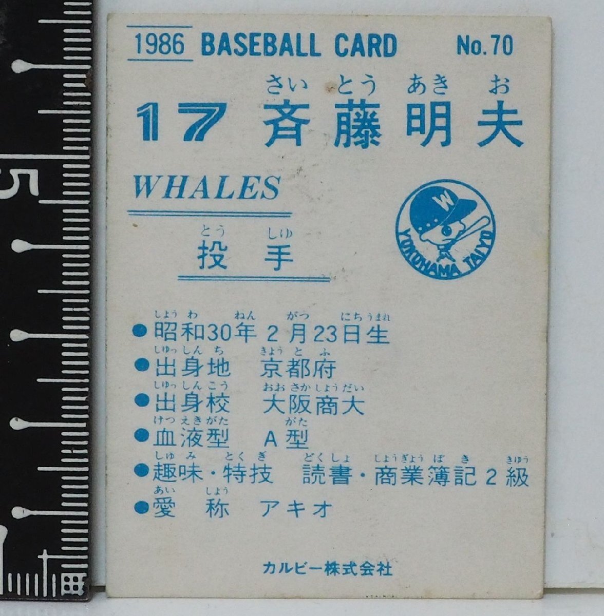 86年 カルビー プロ野球カード No.70【斉藤 明夫 投手 横浜大洋ホエールズ】昭和61年 1986年 当時物 Calbee おまけ 食玩 BASEBALL【中古】