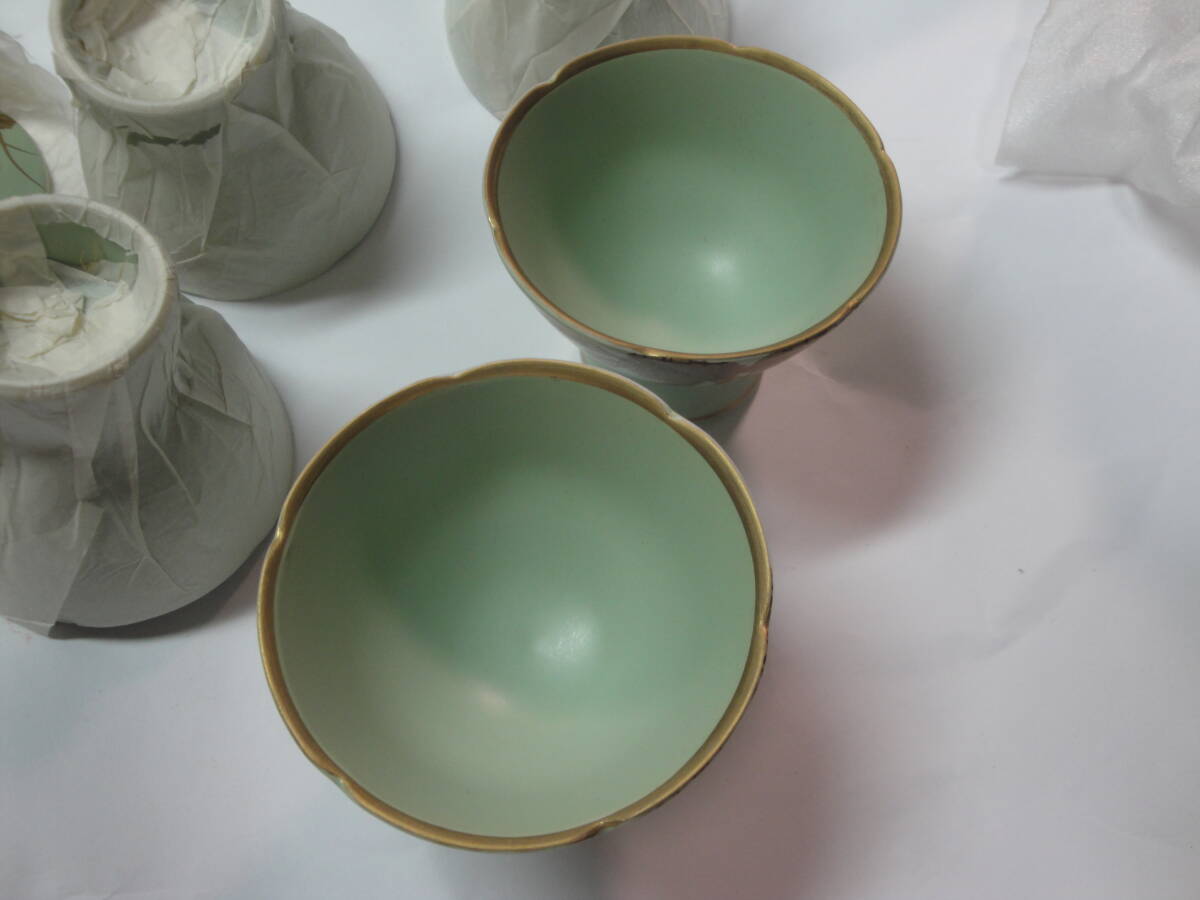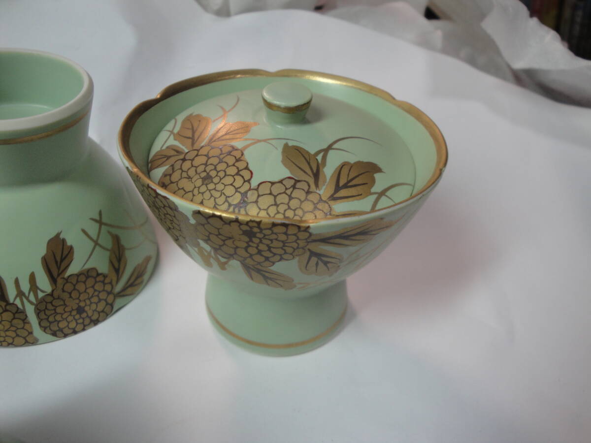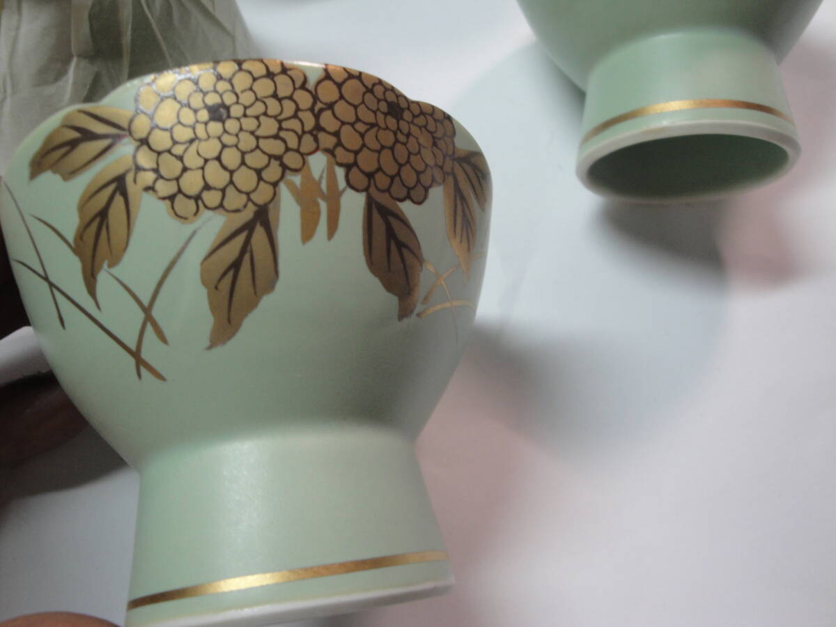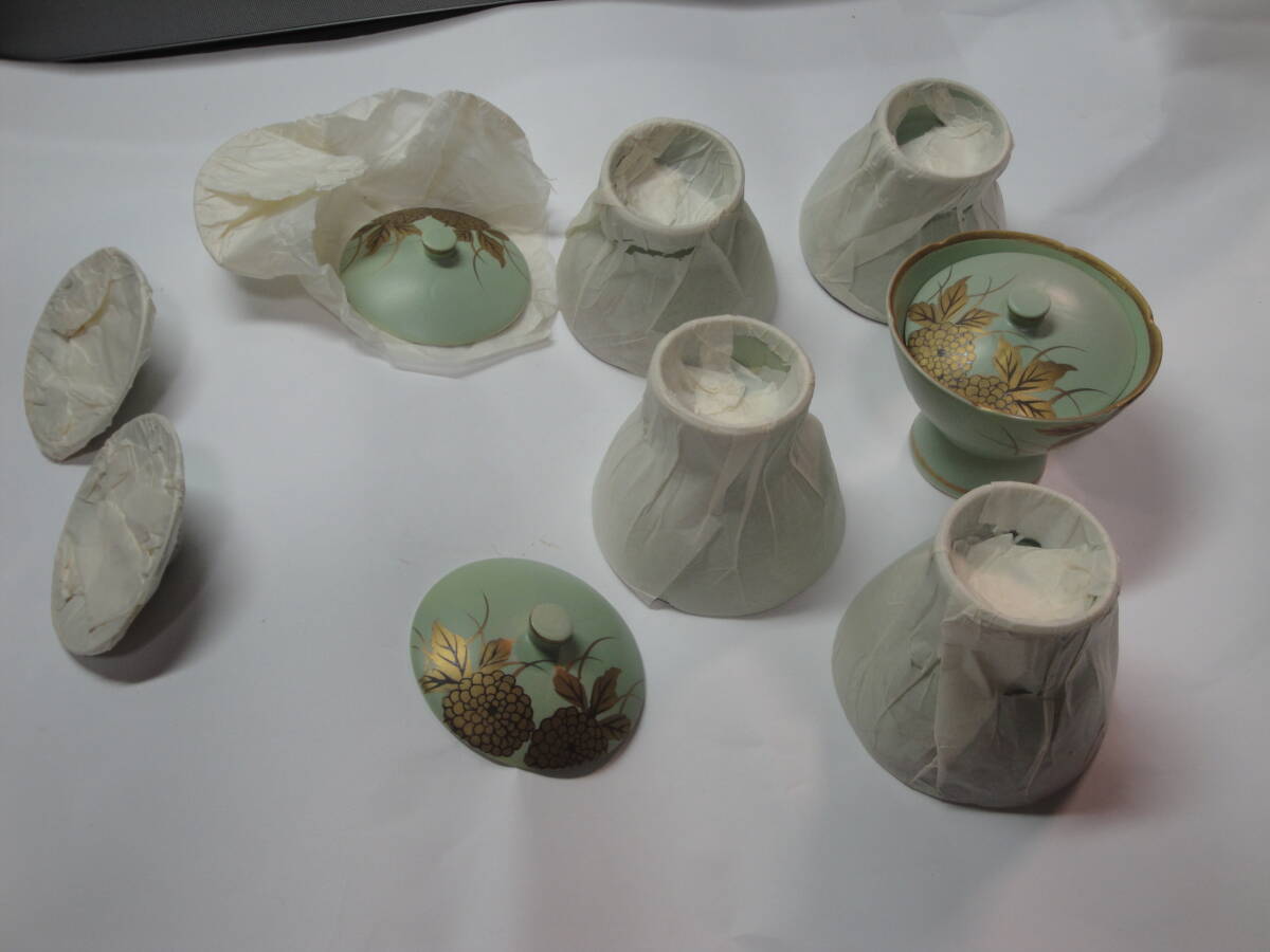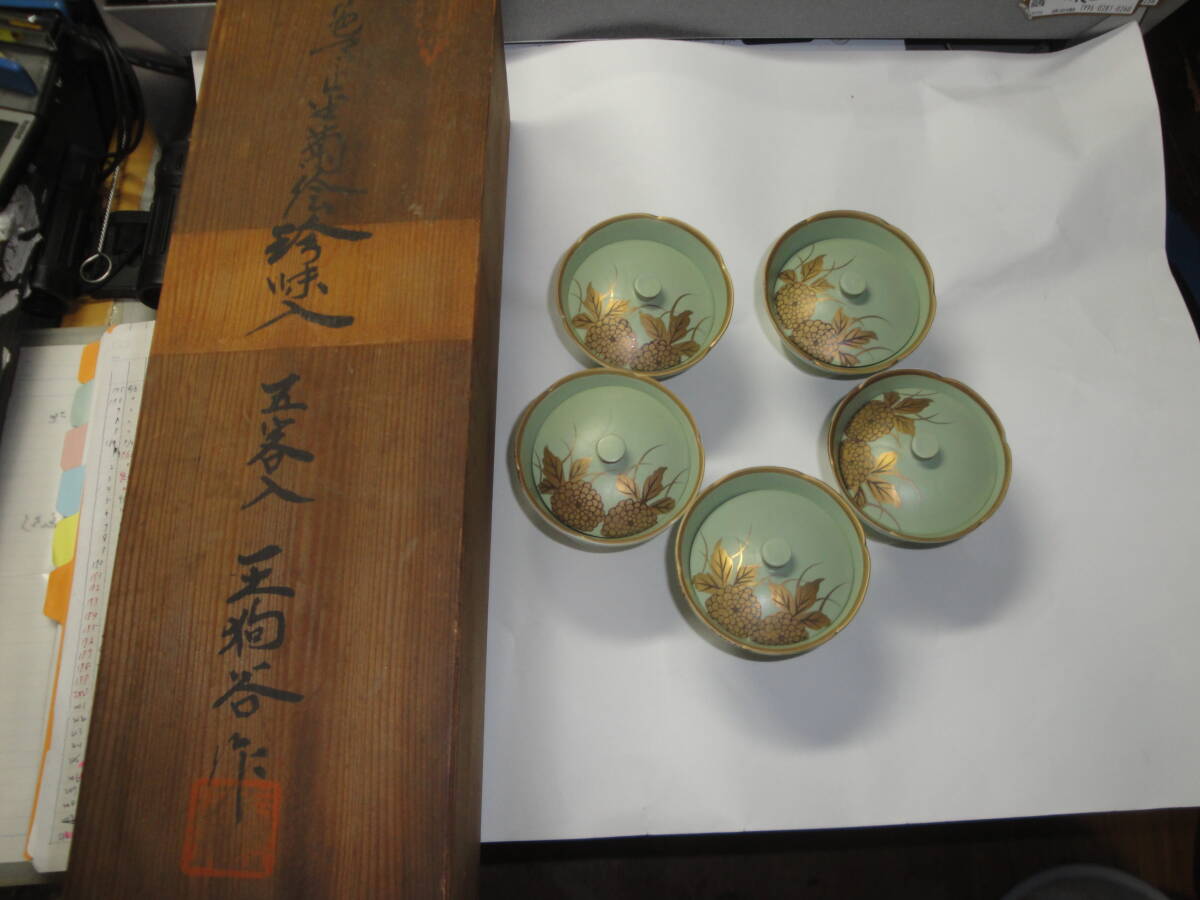 ☆有田焼 天狗谷窯《天狗谷作:草色マット金菊絵珍味入(蓋付・5客)》☆です。1、箱サイズ:約38.5×11.5×11.5cm、重さ約1080g(全て)。2、珍味入れ:サイズ約上部直径8×高台直径4.5×高さ×蓋直径6.8cm、重さ約115g私見ですが、長期保管の未使用品と思われます。現状を保つため珍味入れの洗浄等は一切おこなっておりません。写真のように当時の包装紙等を使用していることをご了承願います(昆虫のふん汚れ・混入等も考えられます)。写真のものが全てです。写真で判断願います。中古品ですので,新品同様なものをお求めの方・気になさる方のご入札はご遠慮願います。ノークレーム、ノーリターンでお願いいたします。送料はゆうパック80サイズの料金です。  発送は原則週2回です。お手数をおかけしますがご入札の前に、必ずフォローリスト(自己紹介欄)と当該記載内容のご確認をお願いいたします(2日以上連絡がつかないときも,お手数をおかけしますがフォローリスト(自己紹介欄)をご覧の上ご連絡をお願いいたします)。中古品でございますのでノークレームでお願いいたします。問題発生時の対応につきましては、誠意をもって対応させていただきます。メールをいただければ5日程度の取置き(同梱)はOKですのでぜひご利用ください。落札後7日以上連絡が取れないときは自動的にキャンセルさせていただきます。(注)①迅速に対応するため、“「取引ナビ」:取引メッセージ”でお願いいたします。②ゆうパック(着払いの対応はいたしません)ご利用の場合、請求送料は郵便局への持込み割引を含み一切割引の無い料金とさせていただきます(実際の発送料金とは、120円の差があります)。③状態の判断はあくまでの私見ですのでご理解願います。④評価の悪いが5個以上の方、新規の方は、お取引を確実にしていただける旨ご連絡ください。ご連絡のない場合は削除させていただきます。⑤ご入札後のキャンセルはできませんので十分に注意してご入札に参加願います。⑥領収書の発行はできません 。⑦万一、落札品が欠品・不具合で取引出来ない場合は,誠に申し訳ありません。実費(ご落札金額、送料、振込手数料)のみにて対応させていただきます。【必ず自己紹介をお読みください。対応や発送できない期間などご案内しております】