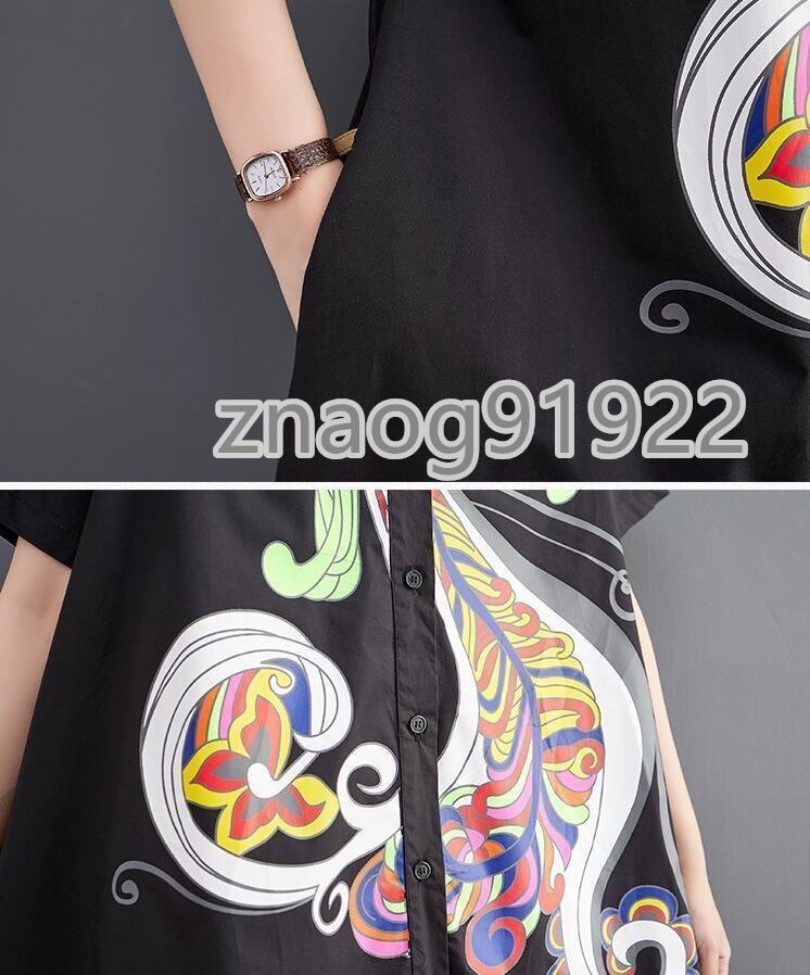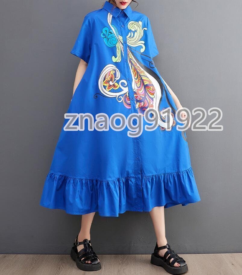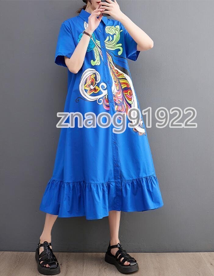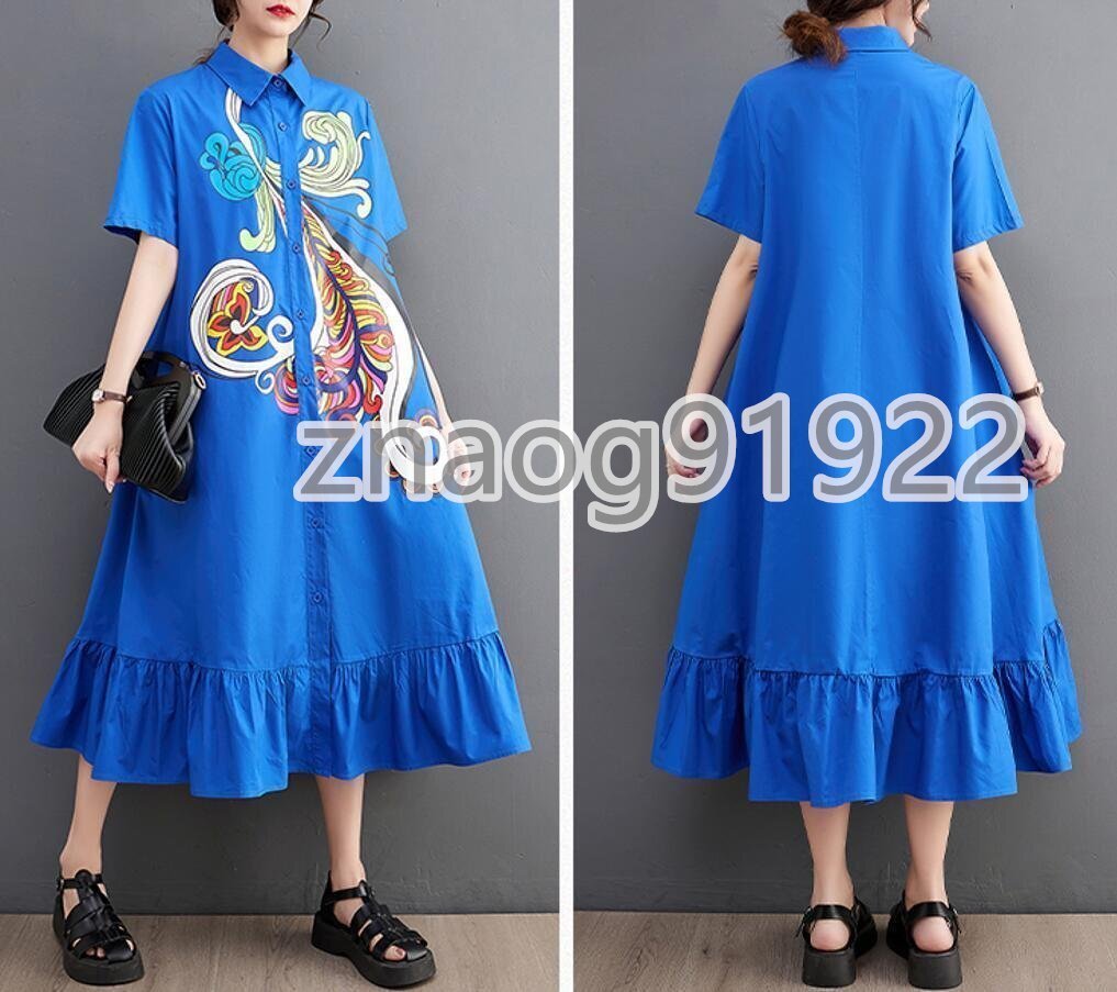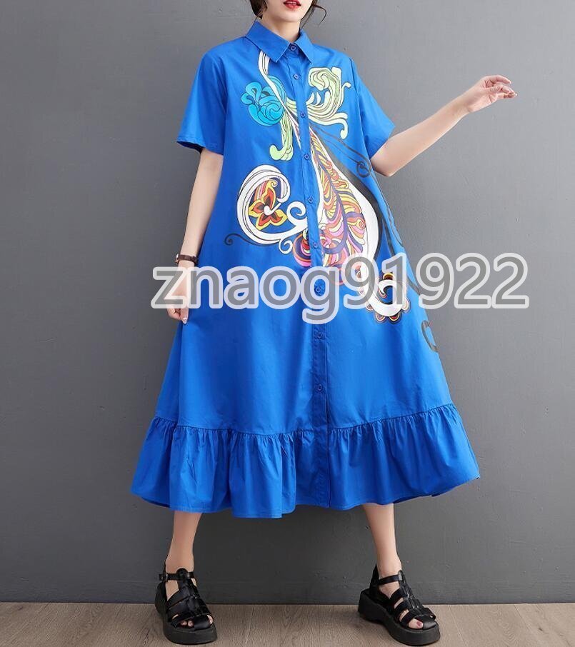 Fサイズ■夏新品 上質 超綺麗 プリント ロング丈 シャツワンピース レディース 半袖 体型カバー 大きいサイズ★ブルー