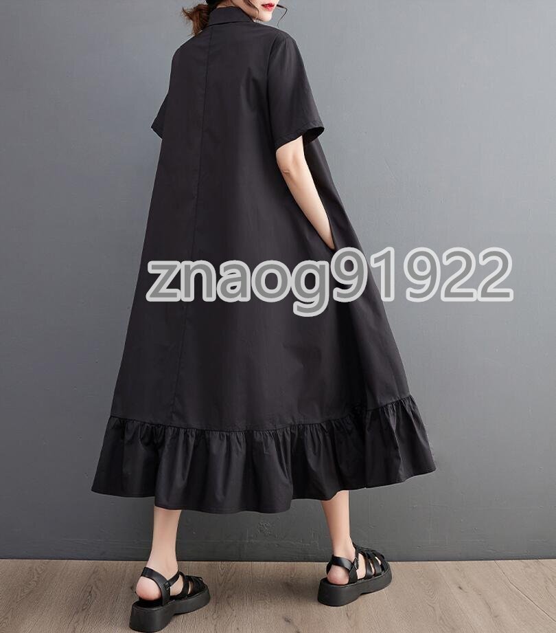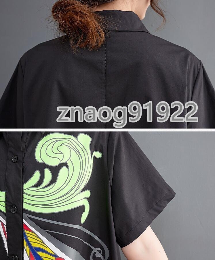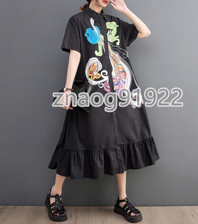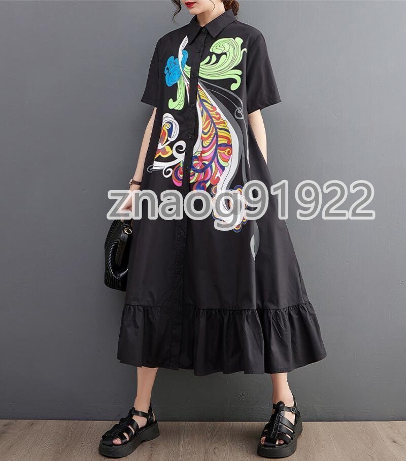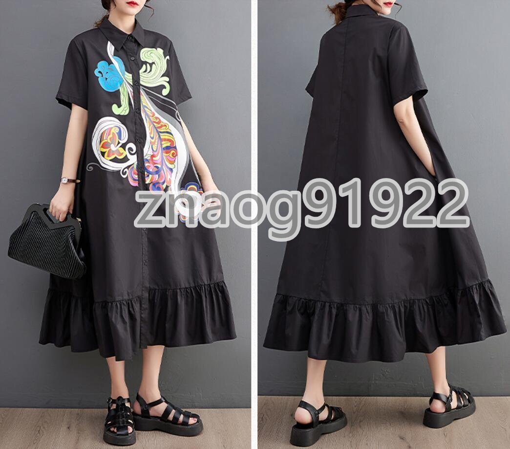 Fサイズ■夏新品 上質 超綺麗 プリント ロング丈 シャツワンピース レディース 半袖 体型カバー 大きいサイズ★ブルー