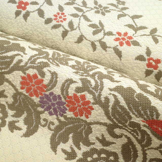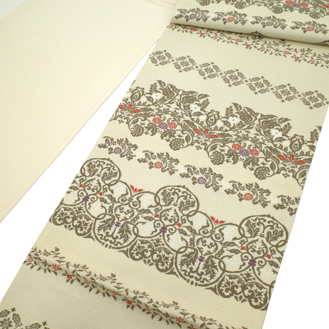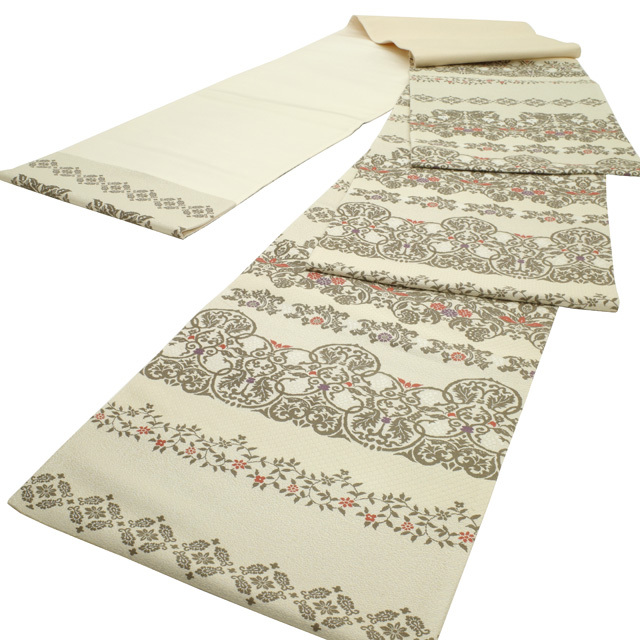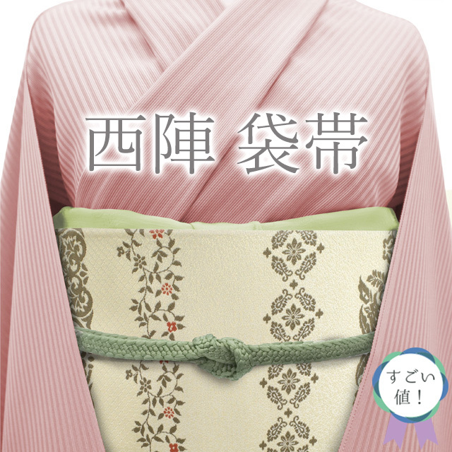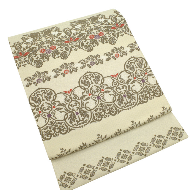 【中古】 すごい値! 袋帯 リサイクル 京都 西陣 正絹 クリーム色 横段 花唐草 葡萄唐草 セミフォーマル カジュアル 六通柄 仕立て上がり 春 秋 冬 かわいい 普段着 お出かけ お食事 ショッピング 観劇 七五三 お祝い パーティー など幅広いシーンに 販売 購入 綺麗 美品 たとう紙付き 送料無料 リユース すごいね みやがわ neb01031