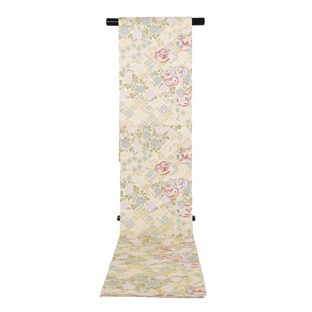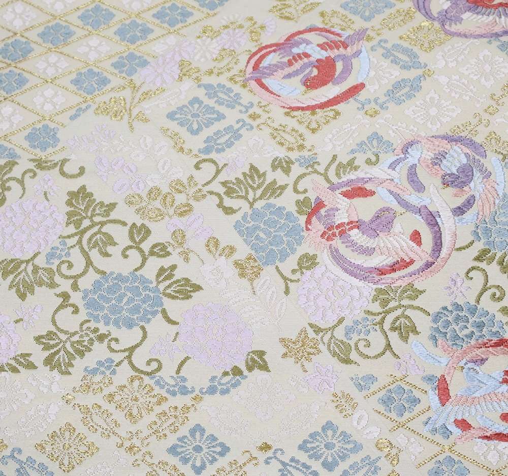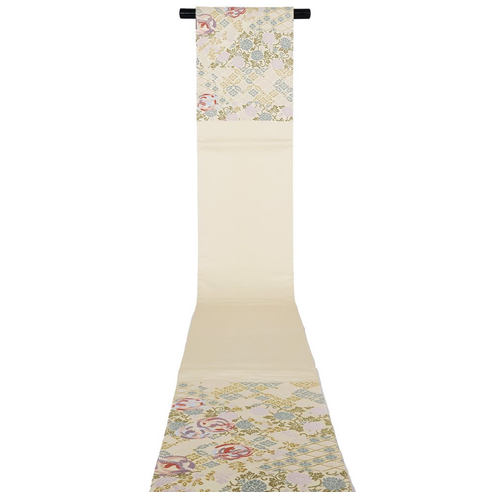 | 西陣織袋帯 箔唐織裂取唐文 ベージュ地 唐織・正倉院文様 花喰鳥・唐花・花菱文 仕立て上がり |