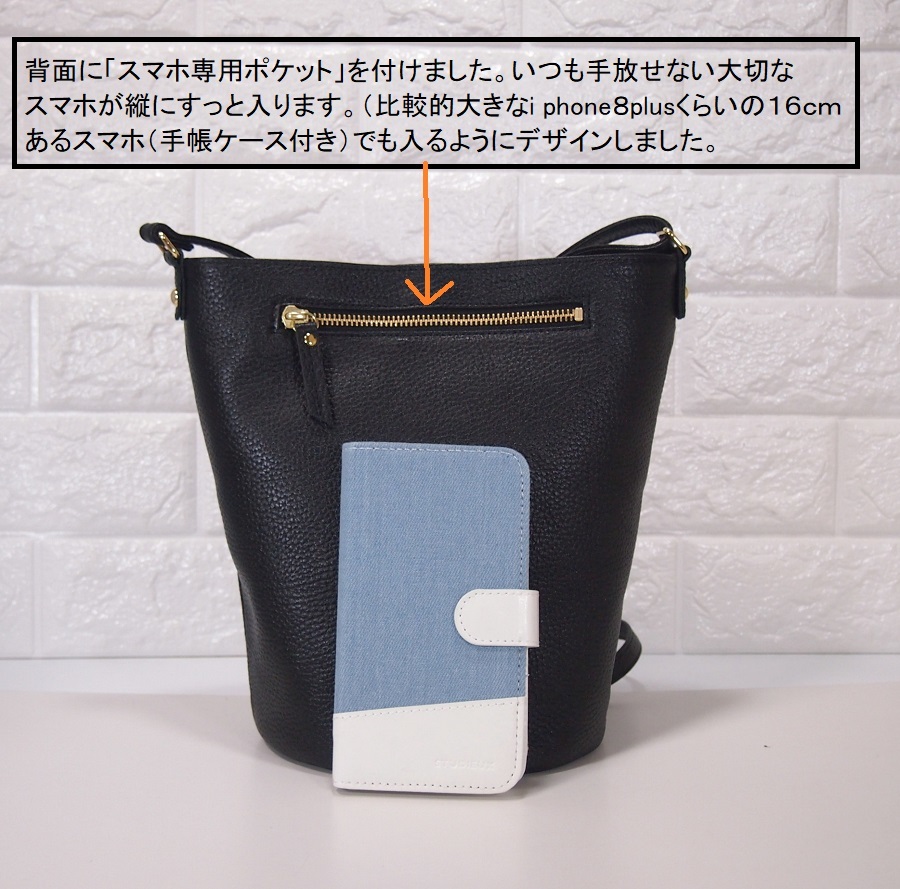 ●画像をご確認ください。背面に「スマホ専用ポケット」を付けました。いつも手放せない大切なスマホが縦にすっと入ります。