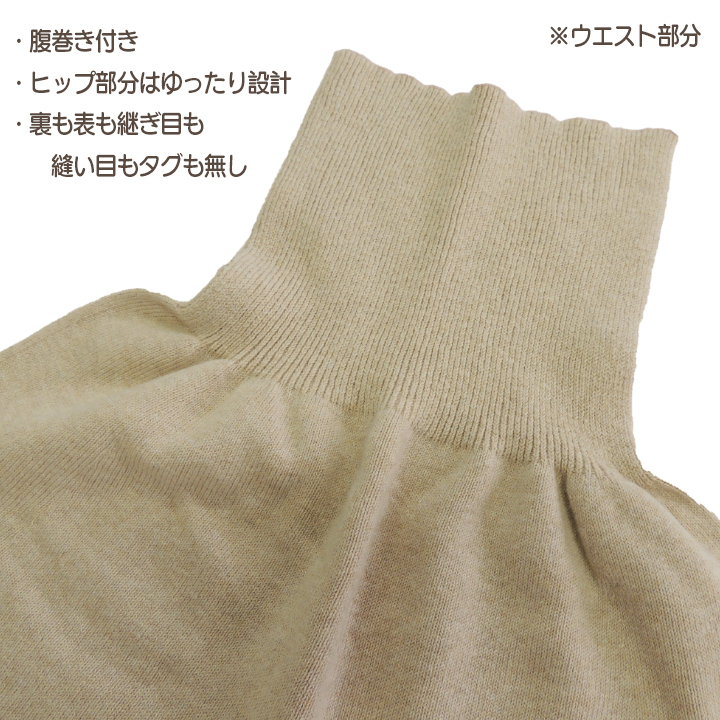 ごろごろする縫い目がなく、どこにもタグが付いていないので敏感肌の方にもおすすめです。特に冷える腹部、腰は無縫製の特徴の変則編みで肌当たりが良い形状に仕上げています。