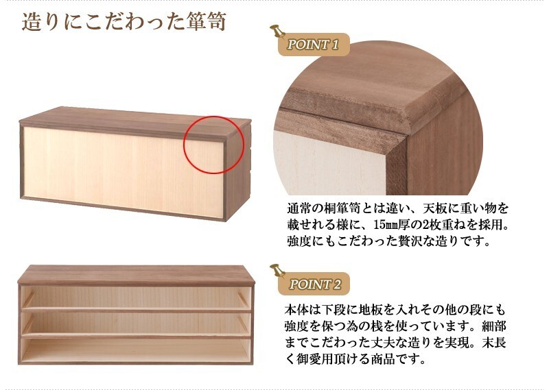◇通常の桐箪笥とは違い、天板に重い物を載せられる様に、15mm厚の2枚重ねを採用。強度にもこだわった贅沢な造りです。本体下段に地板を入れ、その他の段にも強度を保つ為の桟を使っています。細部までこだわった丈夫な造りを実現。末長く御愛用頂ける商品です。