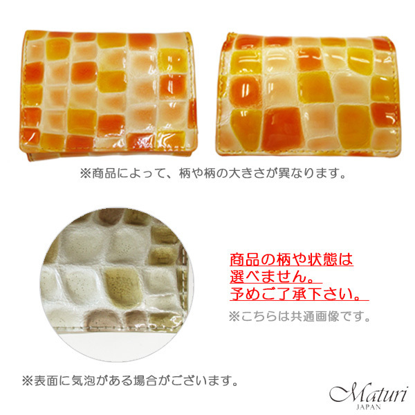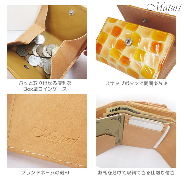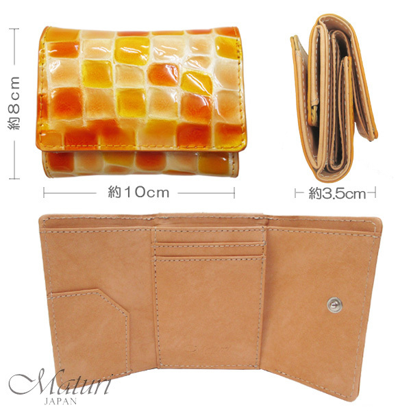 手のひらに収まるサイズのミニウォレットは、 牛革を使用しているとは思えないほどのルックス。 ジュエリーのような可愛いカラーと、ぷっくりコロンとした手触りが女性の心を惹きつけます。 凹凸のあるエナメル加工で、多少の水滴もサッと拭き取れ、 トレンドのミニバッグにもスッと入ります。 コンビニやちょっとしたお買い物はポケットIN。 札入れには中仕切りがあり、お札とレシートに分けることもできます。 ボックス型のコインケースは小銭が見やすく出し入れもスムーズ。 もちろんカード収納もあり、手放せなくなる便利な極小ウォレットです。 ■定価21000円 ■カラー:オレンジ ■サイズ(約):縦8cm×横10cm×マチ3.5cm (商品によっては多少の誤差があります。予めご了承下さい) ■素材:外側/牛革(クロコ型押しエナメル加工)、内側/ボンテッドレザー ■仕様:スナップボタン開閉、札入れ×2(中仕切り)、カード入れ×2、フリーポケット×2、BOX型コインケース×1 ■付属:Maturi専用BOX ■新品・未使用 ※一部共通画像使用 【ご注意】 ※新品未使用ですが、製造過程により商品によっては細かな傷・汚れ、シワ・擦れ等がある場合がございます。 また、多少の縫製ゆがみ・ノリの付着につきましては不良ではございませんので、予めご了承下さい。 ※ご覧のモニターやブラウザの設定、照明等により、画像と実物の色合いが若干異なる場合がございます。 これらについては予めご理解頂いた上でご購入下さい。 | |