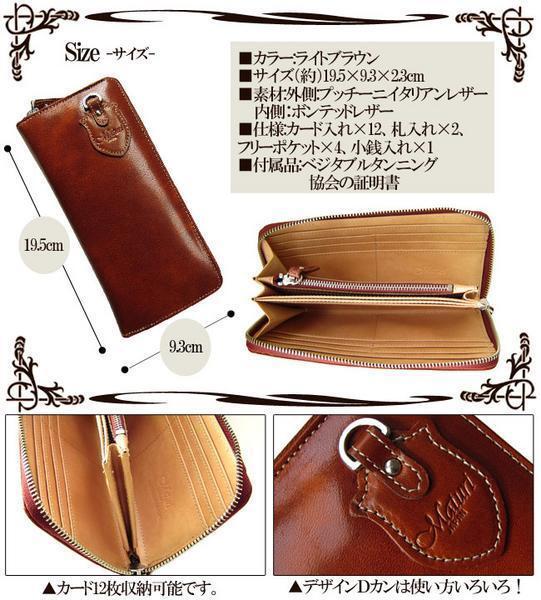 大きく開く札入れポケットは収納力抜群。 カード12枚収納可能ですっきり収まるのがうれしい。 その他フリーポケットが備わっており、多くなりがちなカード類やチケット、レシートなどを しっかり仕分け出来る機能性の高いデザインになっています。 表面のレザーは高い生産基準を満たした「イタリア・ベジタブルタンニング協会」認定の高品質イタリアンレザーを大胆に使用し、 内側はサラマンダー社製のボンテッドレザーを余すことなく使った長財布です。 ■カラー:ライトブラウン ■サイズ(約):19.5×9.3×2.3cm ■素材:外側/プッチーニイタリアンレザー、内側/ボンテッドレザー ■仕様:カード入れ×12、札入れ×2、フリーポケット×4、小銭入れ×1 ■付属品:専用BOX、ベジタブルタンニング協会の証明書 ※Maturiの商品は日本でデザインされた商品です。(生産国:中国) 【ベジタブルタンニング協会の証明書とは】 イタリアの伝統的な革なめし業に従事するタンナーが所属する組合。 小さな血筋、しわ些細な傷は天然素材の証明でありそれぞれの革をこの世で唯一のものにしています。 メンバーが供給するレザーには環境への配慮、皮革の自然さ、鞣し行程の高い生産基準などの条件を満たした、 高品質なイタリアでなめされたベジタブルタンニングレザーであるという証の証明書が付きます。 また、証明書にはシリアルナンバーが一枚一枚印刷されており、偽造出来ない唯一無二のものです。 【ご注意】 革は自然が造り出した理想的な繊維です。 自然由来の素材のため革には細かなシワや傷跡・トラ等が存在する場合があります。 これらは本革である証拠であり、革本来の特長であり、魅力でもありますので、ご了承のほどを宜しくお願い致します。 また、多少の縫製のゆがみ・ノリの付着がある場合がございますが、ご理解頂いた上でご購入下さい。 | |