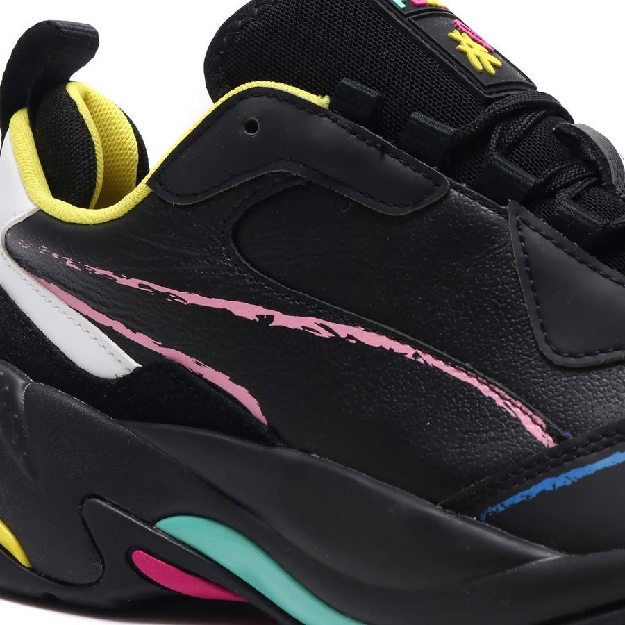 ボリュームソールが特徴的なモデル「サンダー」のブラックベースに、イエローやブルーなどのネオンカラーで