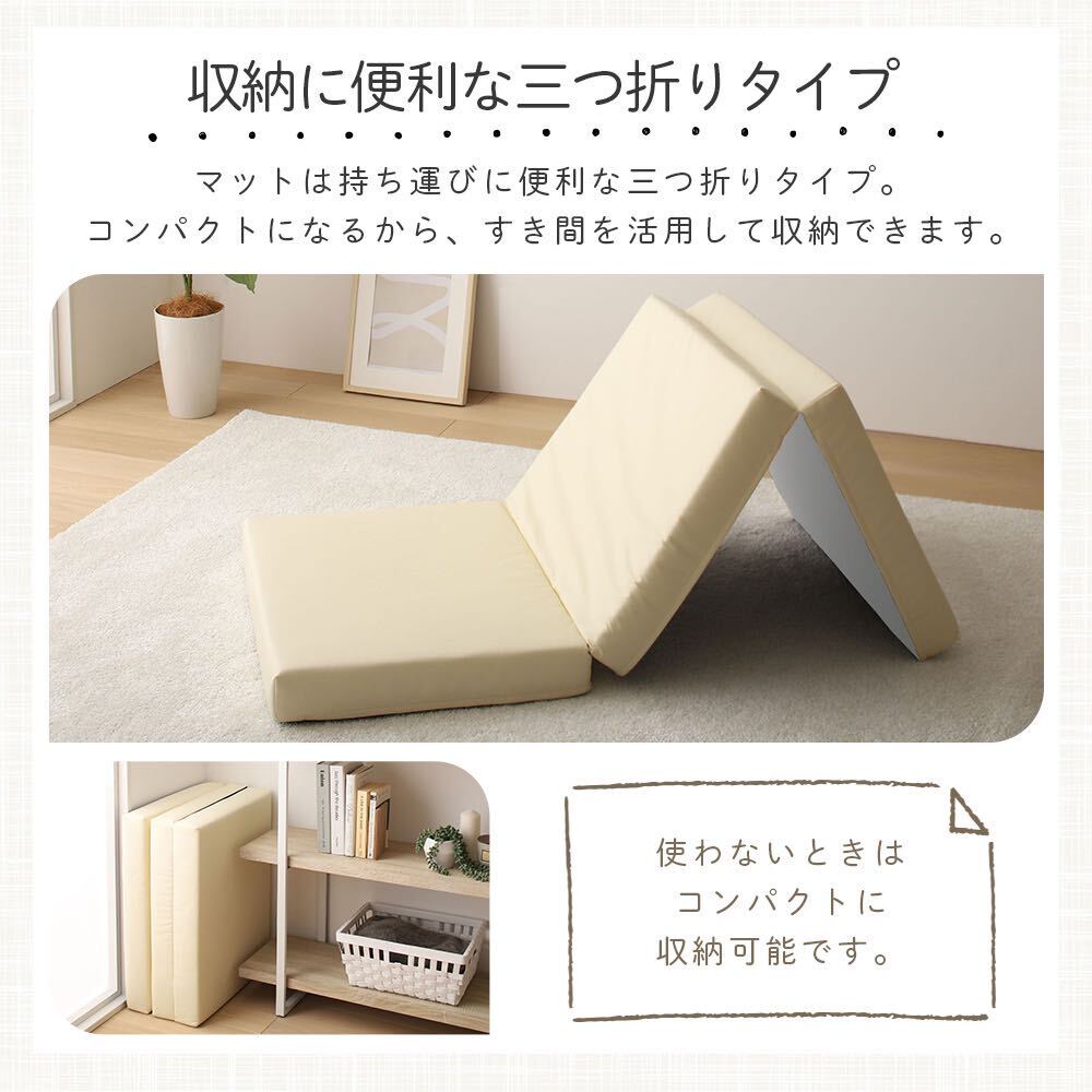 マットは持ち運びに便利な三つ折りタイプ。コンパクトになるから、すき間を活用して収納できます。