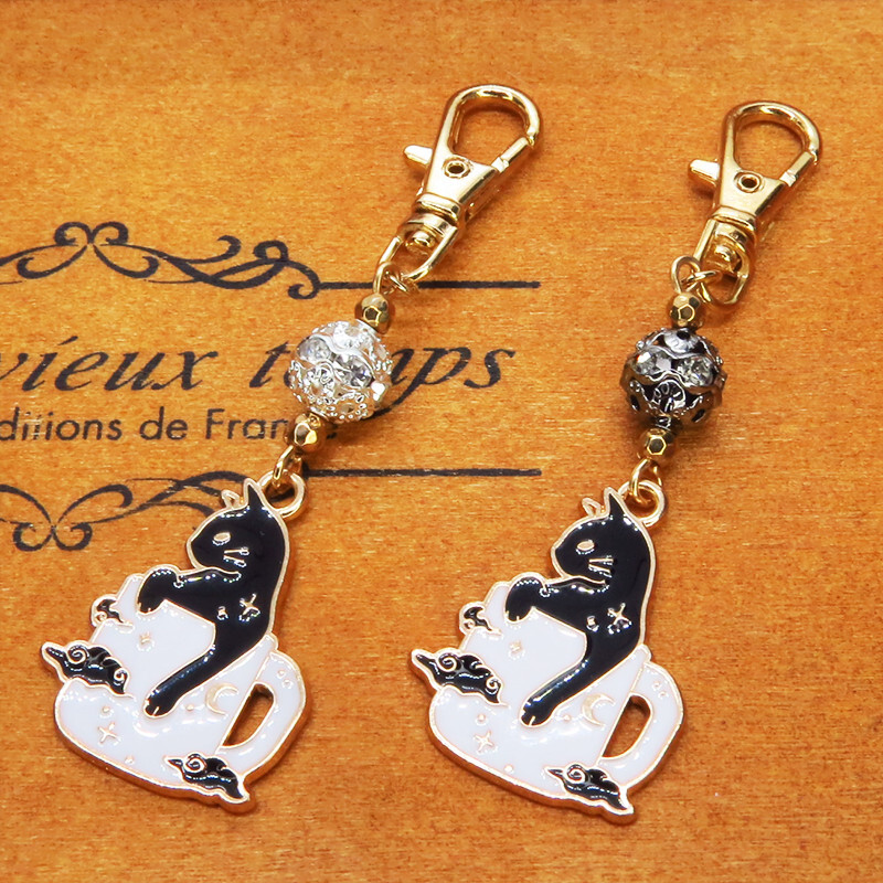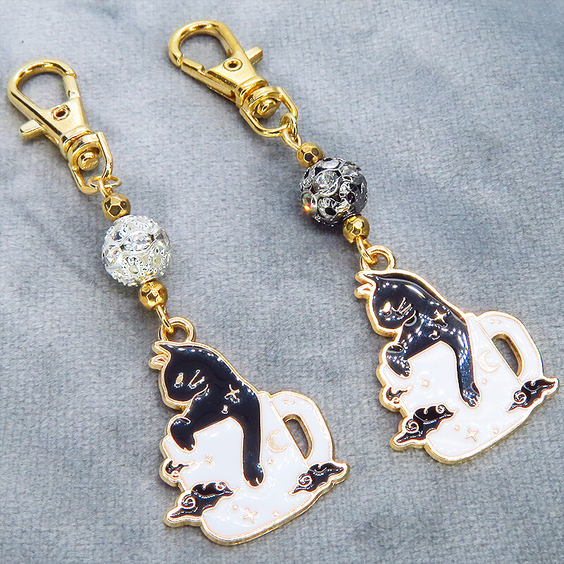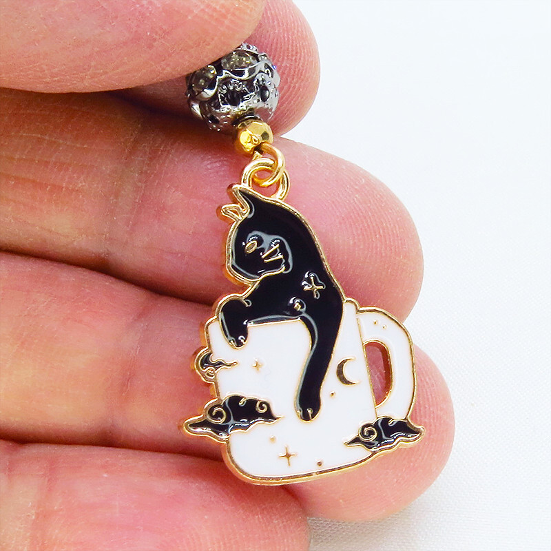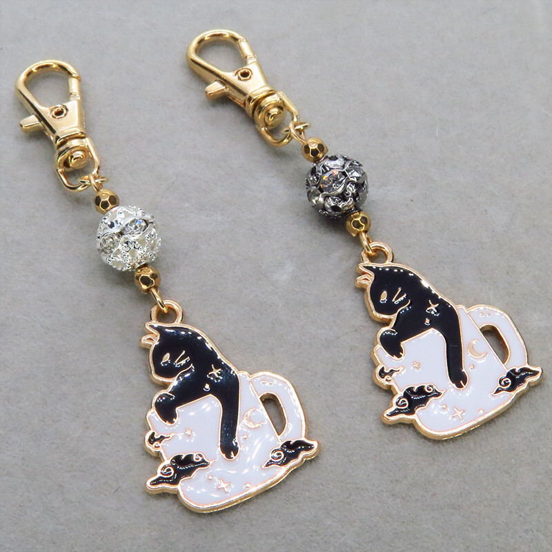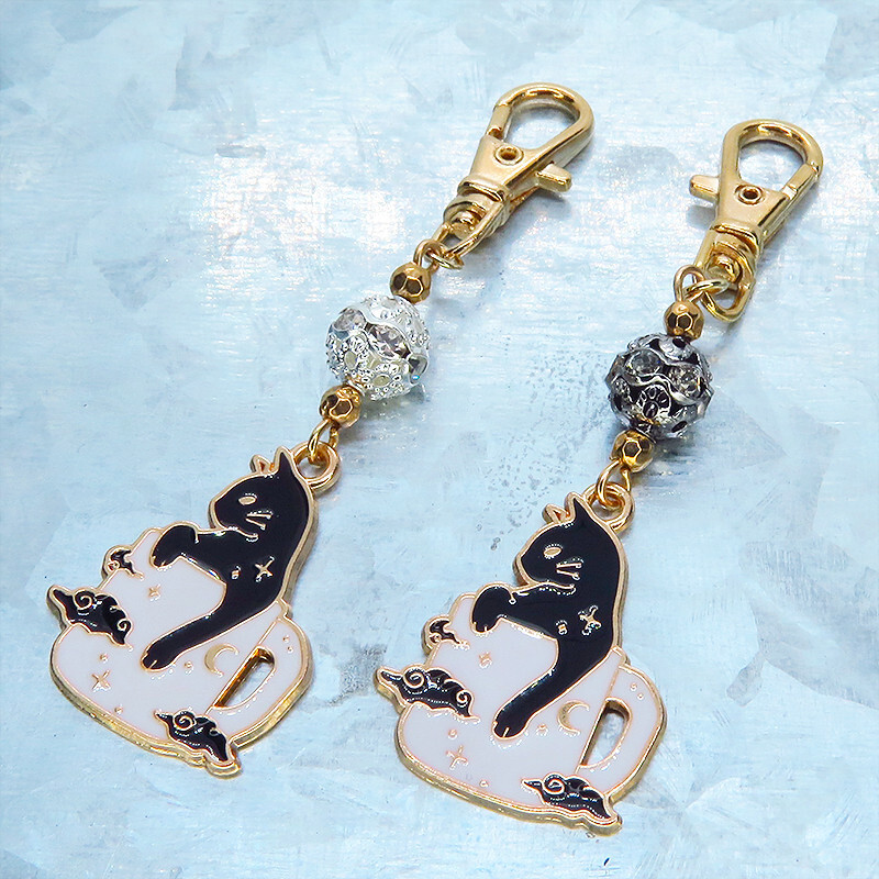 【どちらか1個】白いマグカップでくつろぐ黒猫チャームのキーホルダー シルバー・ブラックメタルビーズ 金具変更可