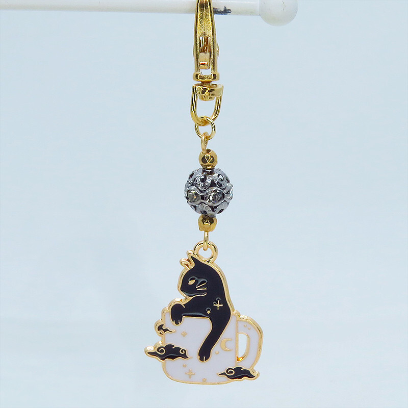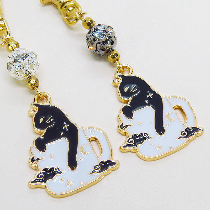 猫のチャームの上にはラインストーン入りのメタルビーズをつなげて華やかさをアップさせています