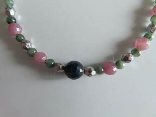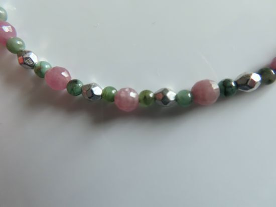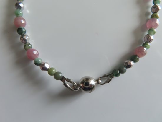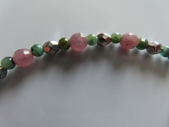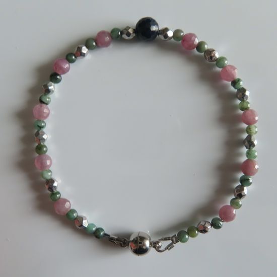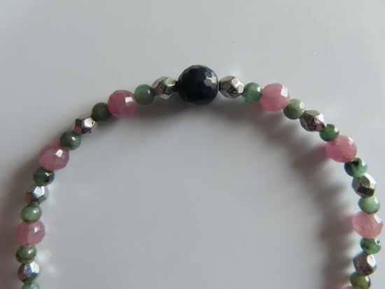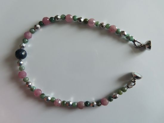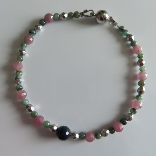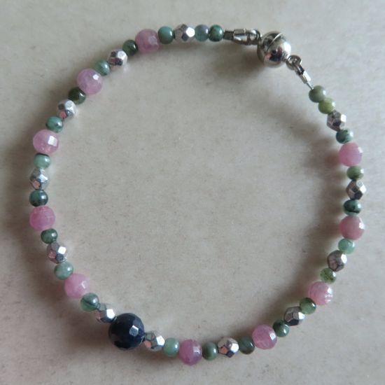 サファイア、ルビー、エメラルド、スペーサーで作ったブレスレットです。 サイズ 16センチ ワイヤー、マグネットクラスプ使用 サファイア64面カット(6ミリ)×1 ルビーカット(4ミリ)×10 エメラルド(2~3ミリ)×24 スペーサー(約4×3ミリ)×12 石には次のような効果があるといわれています。 サファイア・・・・・冷静な思考力、判断力、強い意志をもたらす。 脳細胞を活性化させ、頭脳明晰にする。 組織の経営基盤を固めるのに調和的とされる。 ルビー・・・・・・・生命力、精神力、情熱を高め、官能的にする。 エネルギー活性化。勝利を呼ぶ石。 女性が社会でアクティブに生きていくことをサポートする。 エメラルド・・・・・記憶力、直観力を高める。 持ち主にカリスマ性を与え、富と繁栄をもたらす。 愛の力の強い石で、カップルで付けると浮気防止になると いわれる。 入札時のお願い 石の効果は、これを保証するものではございません。 石の名称、サイズ等は、ビーズ購入時のものをそのまま使用しております。 天然石の性質上、穴回りのカケ、へこみ、ヒビ、黒ずみ、斑点等がある場合がございます。 写真の見え方、特に色ににつきましては、当たる光線の種類、背景の色等によって異なって見えます。 通常、写真は太陽光のもとで、白またはそれに近い色を背景に撮っております。なるべく実物に近くなるように心がけておりますが、照明やパソコンの状態により少し違って見える場合もございます。 また、ハンドメイドですので至らないところもあるかと思いますが、これらのことを御了承のうえでご入札くださいますようお願いいたします。 | |||