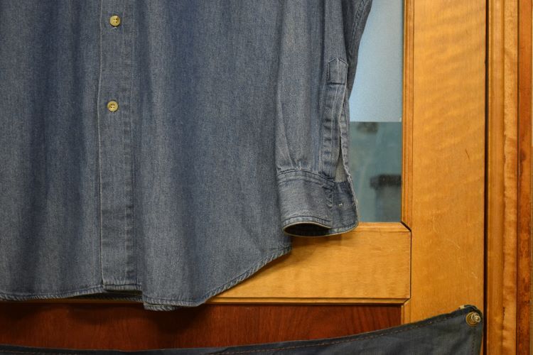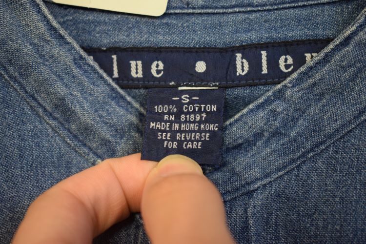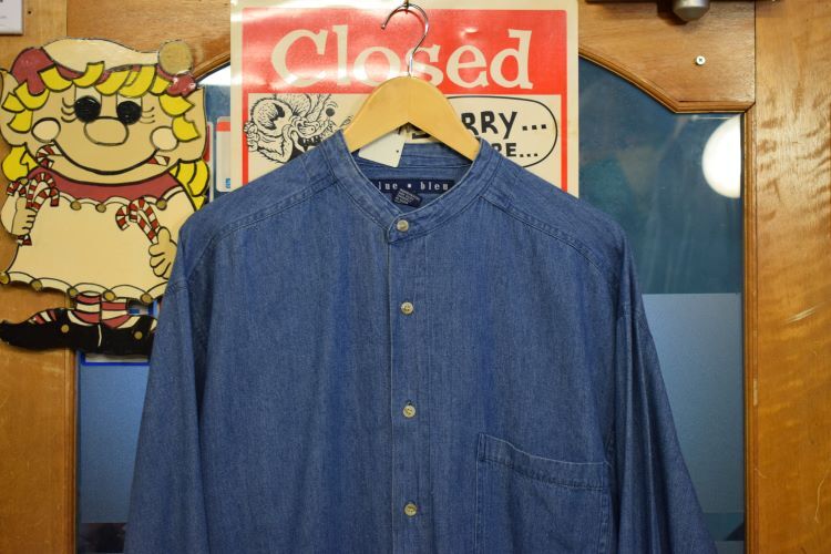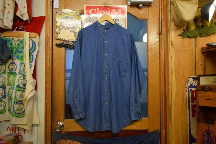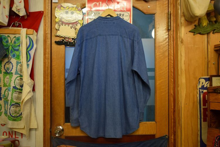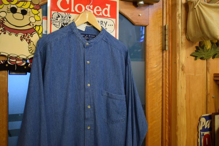 グッドカラー90sビンテージblue・bleu長袖バンドカラーコットンデニムシャツSブルー系アメカジストリート襟無しh23641