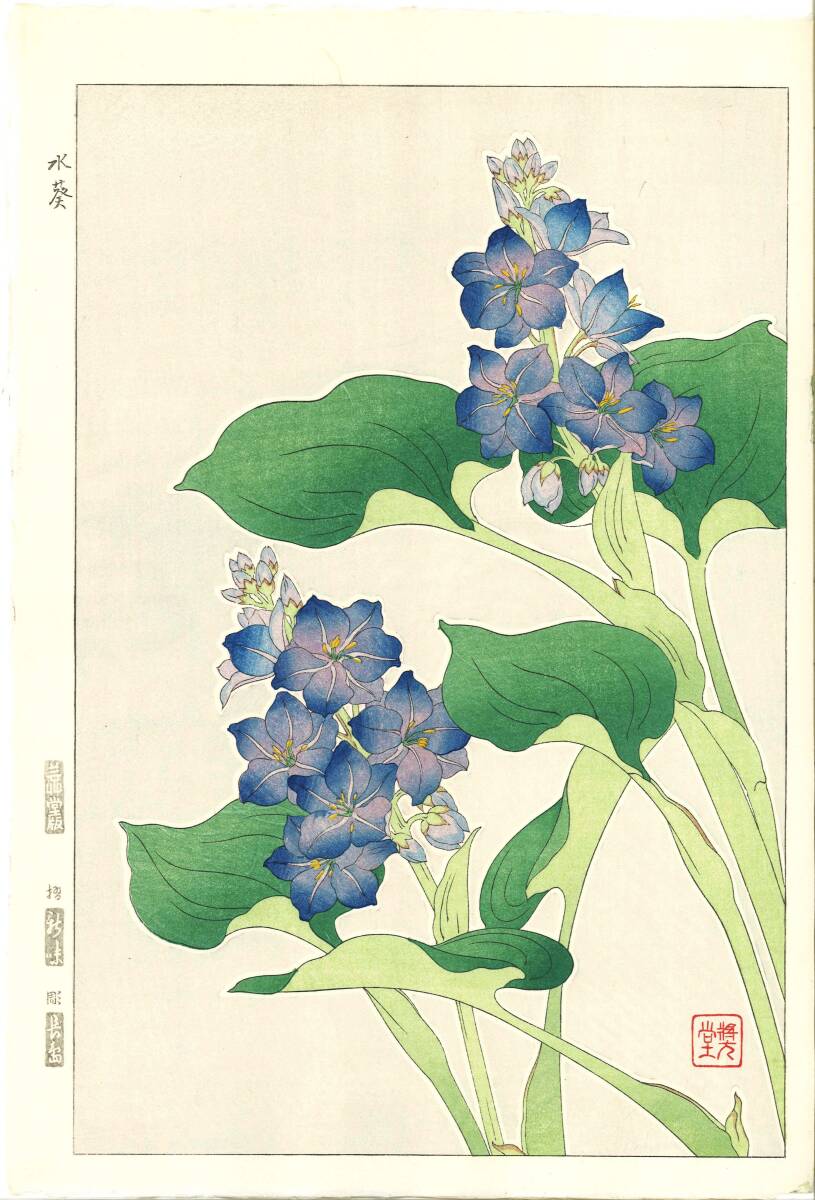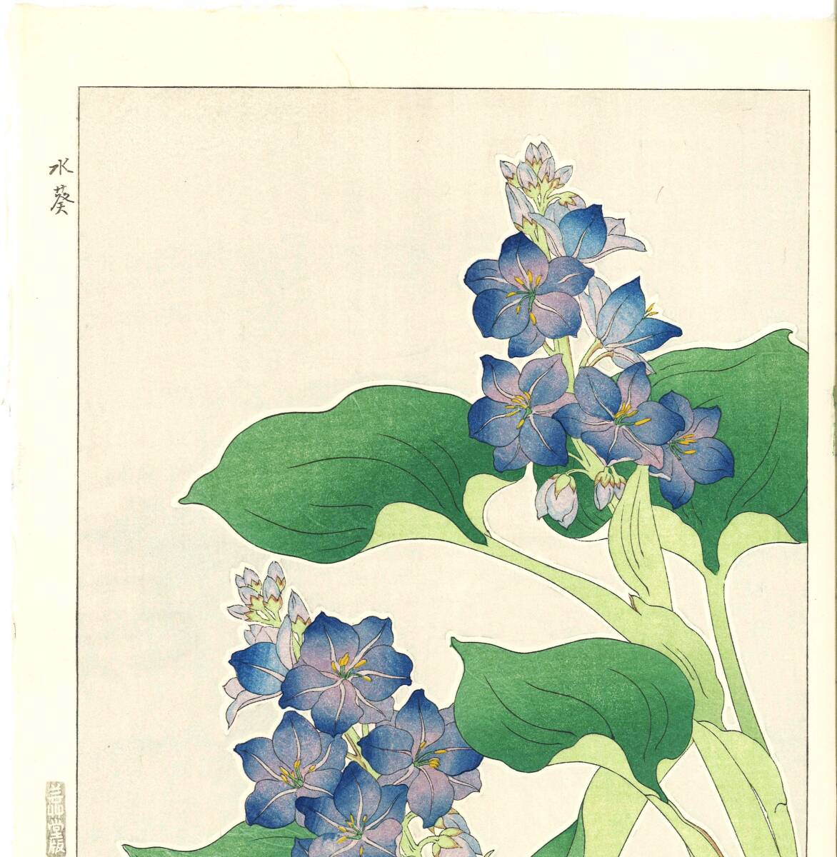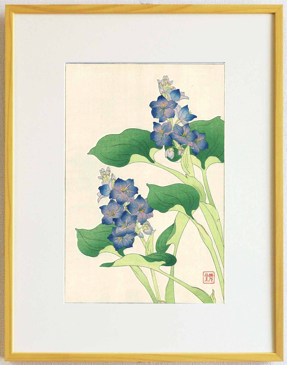 真作保証 額装  河原崎奨堂 木版画   #125 水葵 Water hyacinth   初版昭和中期頃   自宅に届いて直ぐに飾れる京都の名品 花版画!!