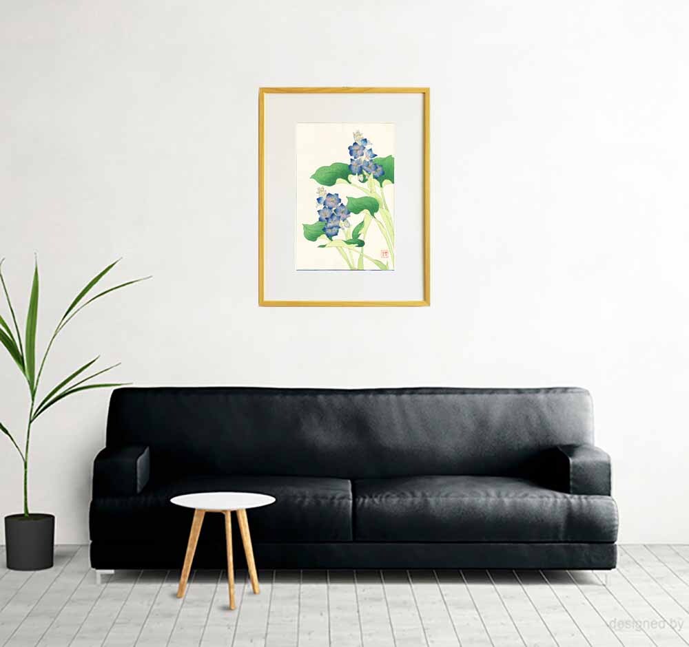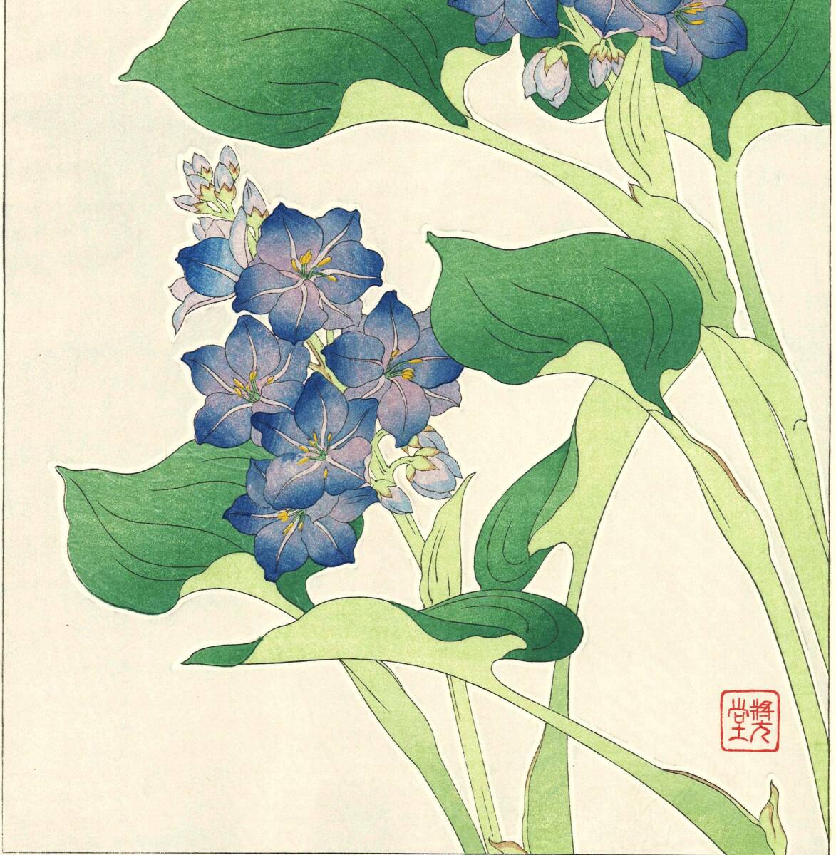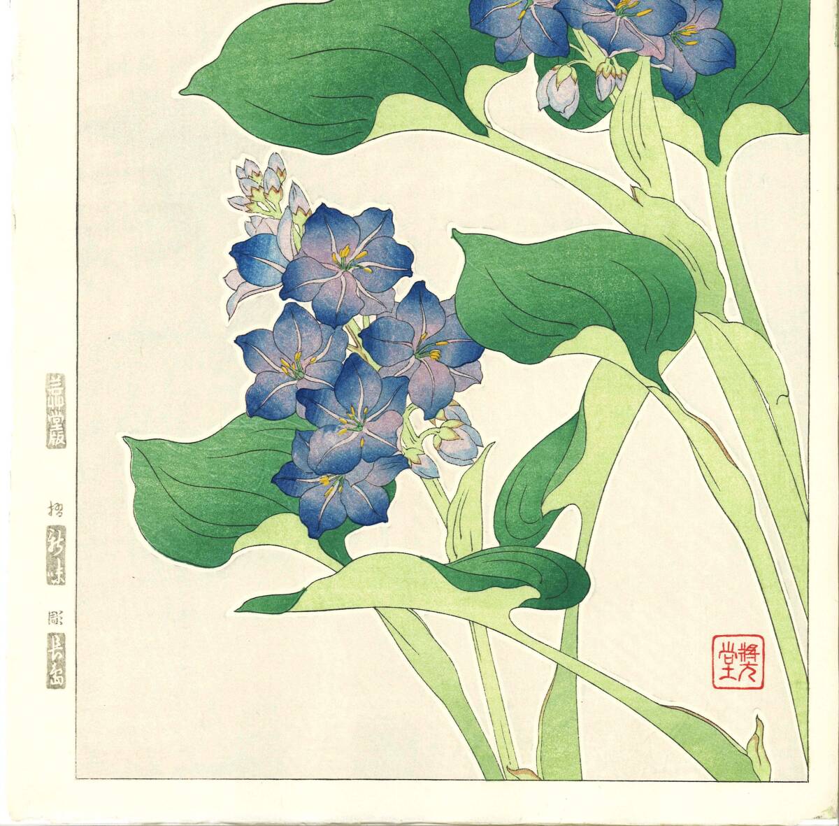 真作保証 額装  河原崎奨堂 木版画   #125 水葵 Water hyacinth   初版昭和中期頃   自宅に届いて直ぐに飾れる京都の名品 花版画!!
