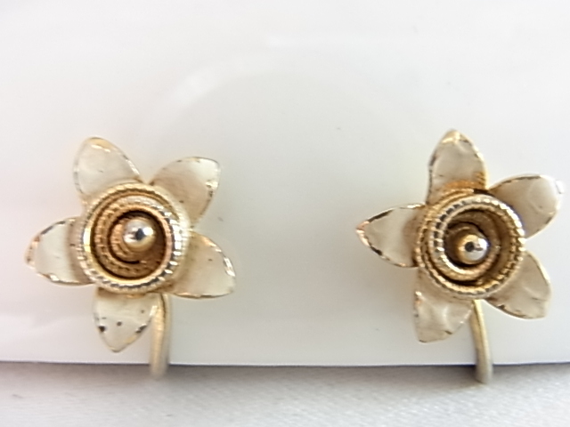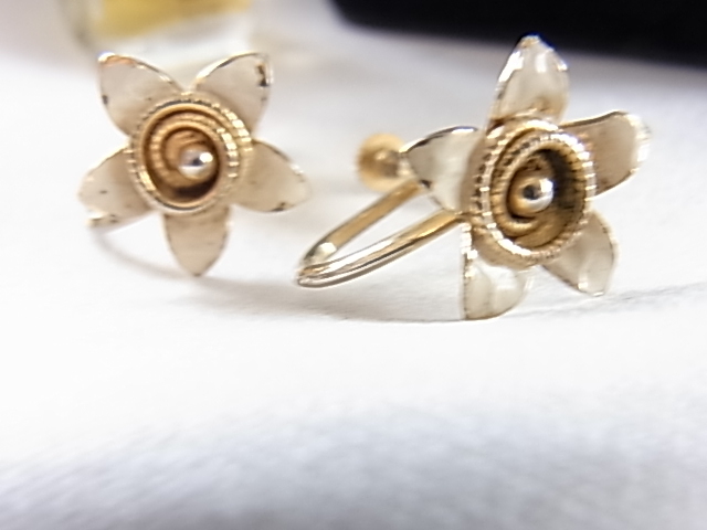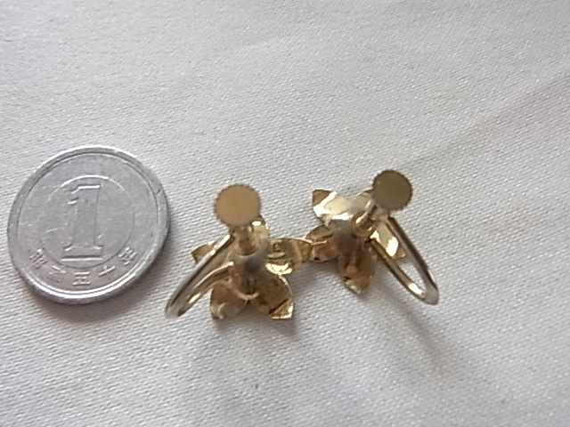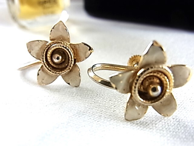 ビンテージ/ヴィンテージ エクリュベージュトーン お花モチーフ 5弁のお花 フラワー エナメル装飾 小さめで控えめ素敵イヤリング▽