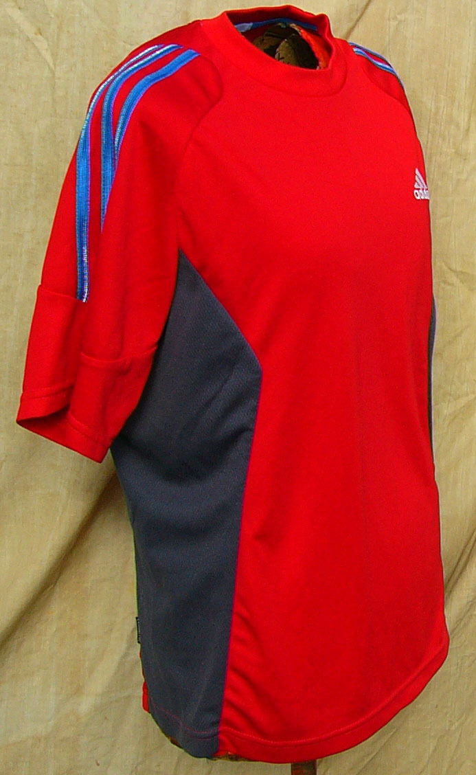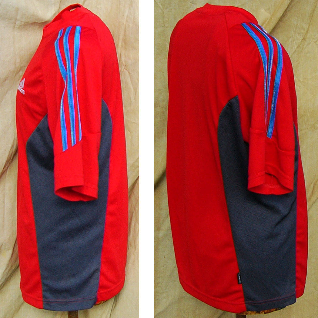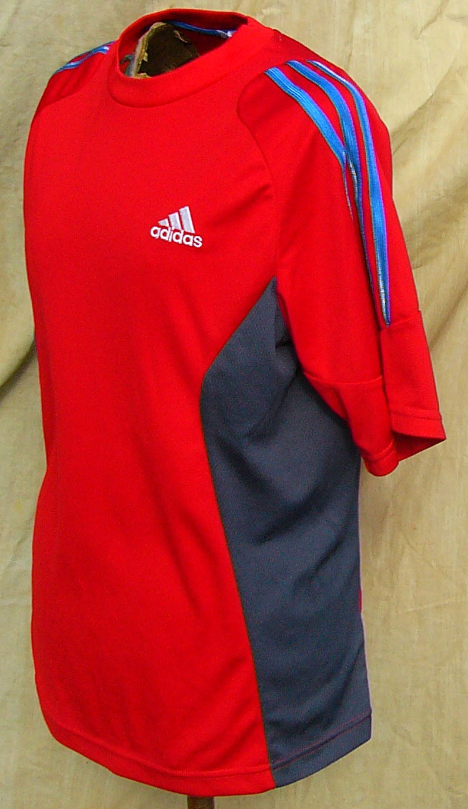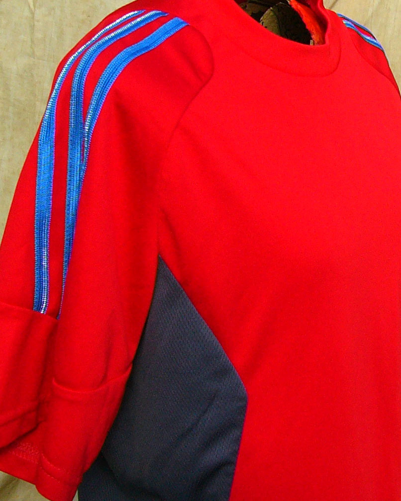 ベースの色は赤、肩ラインは光沢あるブルーの生地を貼り付け、サイドは黒に近いグレー