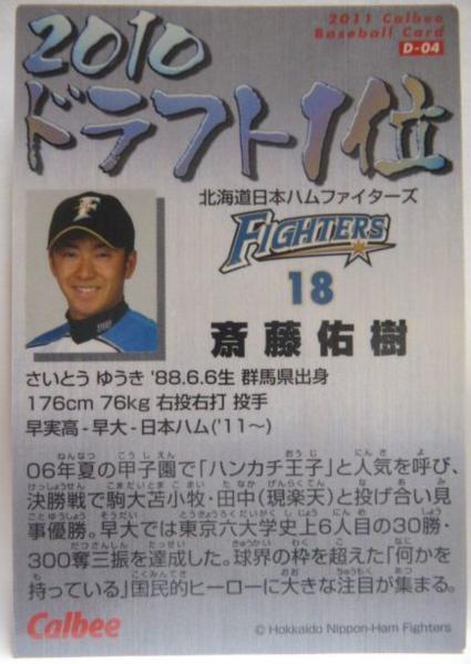 カルビープロ野球カード2011年ドラフト1位 D-04【斎藤 佑樹(北海道 日本ハム ファイターズ)】平成23年チップスおまけ食玩【中古】送料込