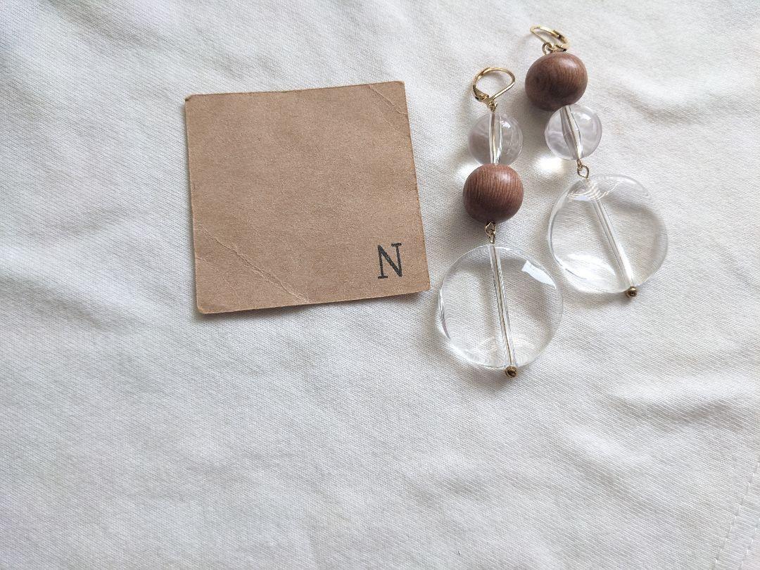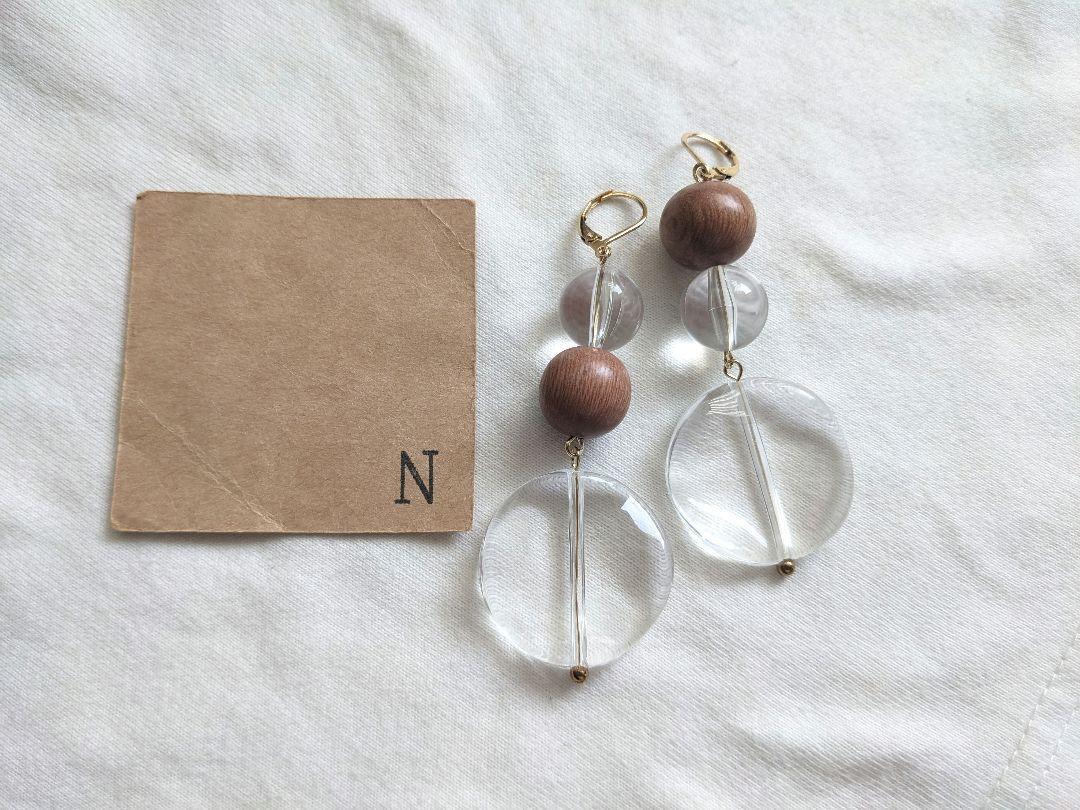 クリアビーズとウッドビーズのアシンメトリーピアスです。大ぶりピアスでお洋服のアクセントに。ロングワンピースやワイドパンツ、デニム、ブラウス、シャツなどに。