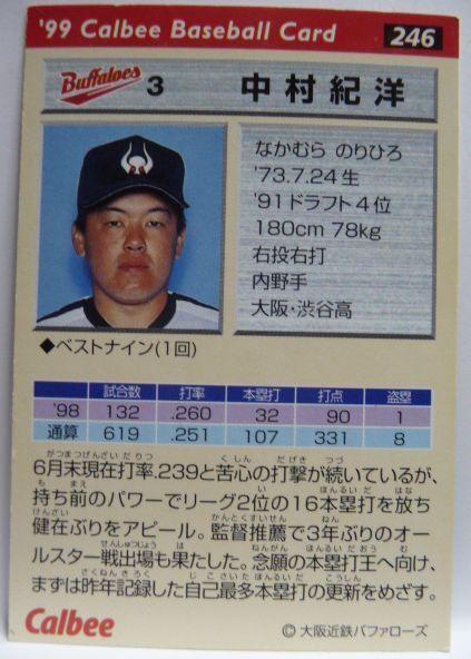 カルビープロ野球カード99年#246【中村 紀洋(大阪 近鉄バファローズ)】平成11年1999年チップスおまけ食玩トレーディングカード(中古)送料込