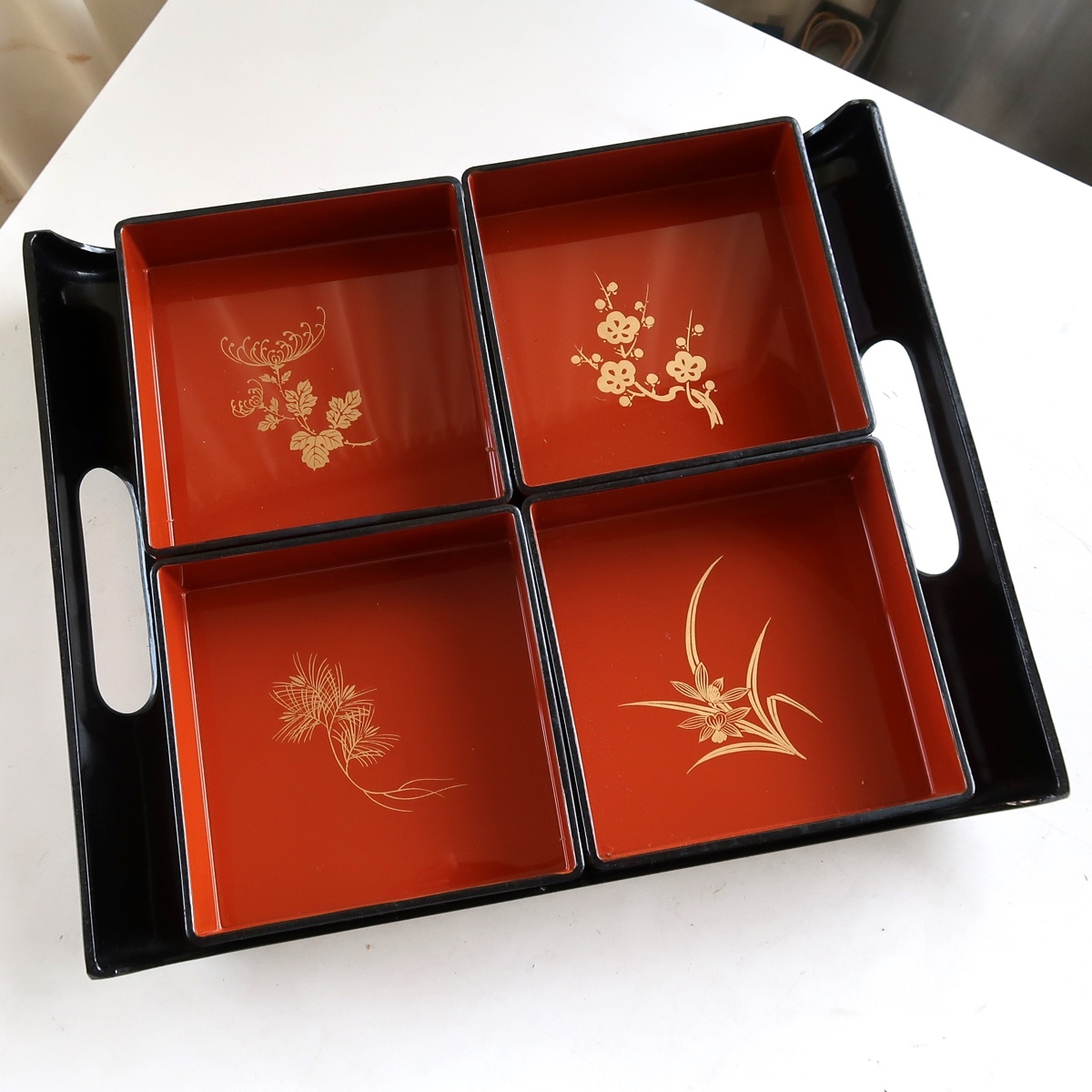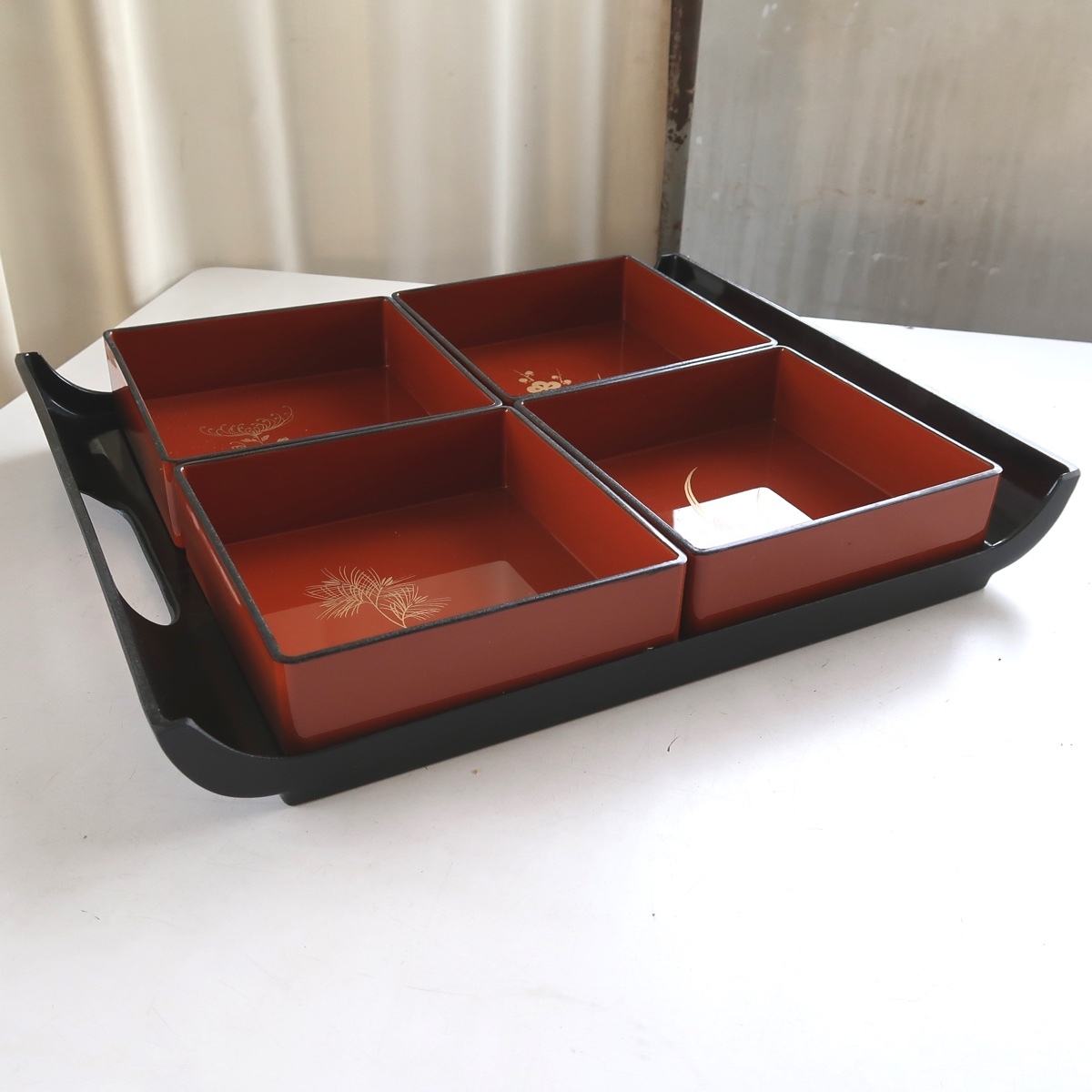 樹脂製 ウレタン塗装 花文 角小鉢 4個セット 盆付 未使用 長期保管品です。